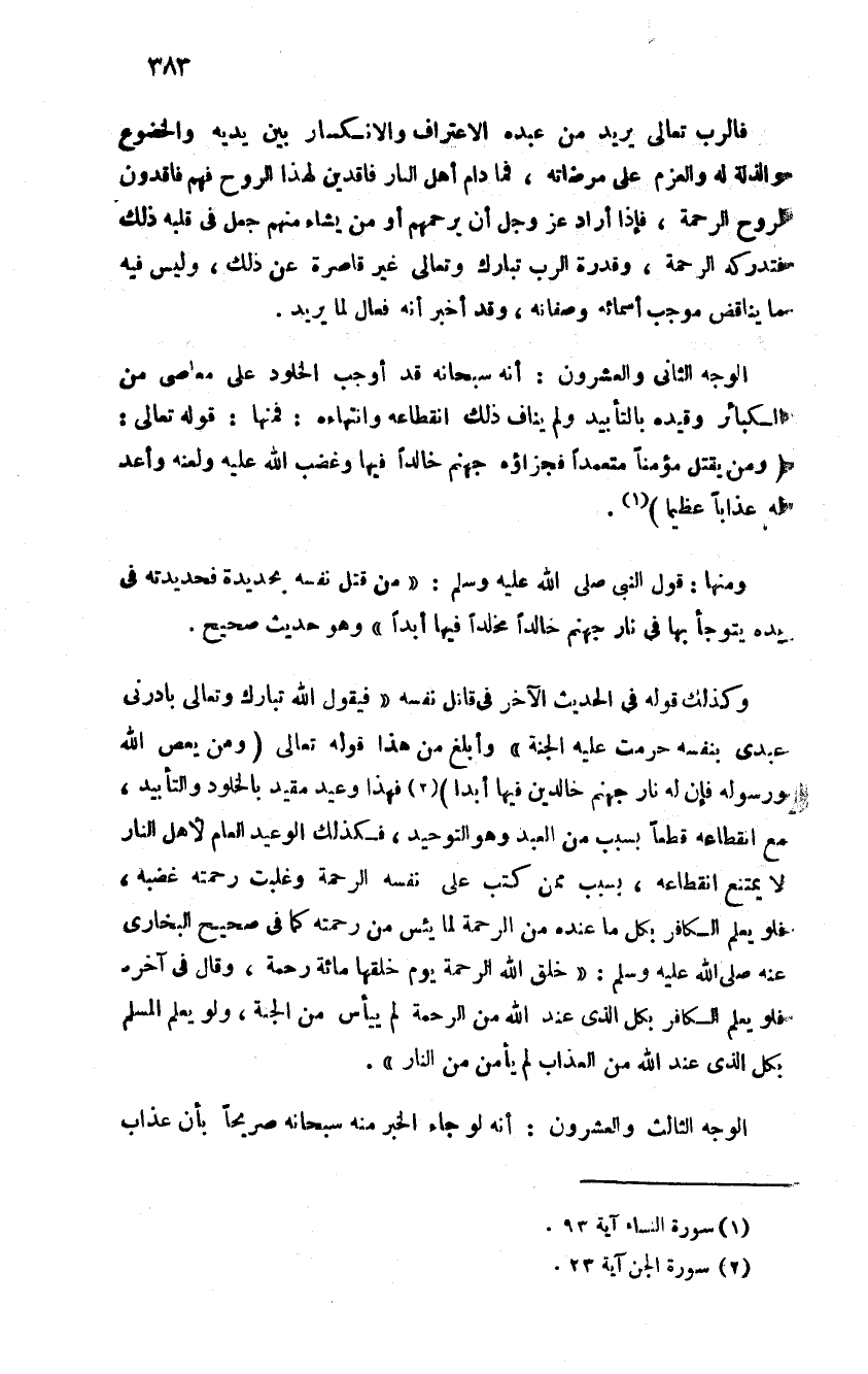 فالرب تبارك وتعالى يريد من عبده الاعتراف والانكسار بين يديه والخضوع والذلة له والعزم على مرضاته فما دام أهل النار فاقدين لهذه الروح لروح فهم فاقدون الرحمة فإذا أراد عز وجل إن يرحمهم أو من يشاء منهم جعل في قلبه ذلك فتدركه الرحمة وقدرة الرب تبارك وتعالى غير قاصرة عن ذلك وليس فيه ما يناقض موجب أسمائه وصفاته وقد اخبر أنه فعال لما يريد الوجه الثاني والعشرون أنه سبحانه وتعالى أوجب الخلود على معاصي الكبائر وقيده بالتأبيد ولم يناف ذلك انقطاعه وانتهاؤه فمنها قوله تعالى: {وَمَنْ يَقْتُلْ مُؤْمِناً مُتَعَمِّداً فَجَزَاؤُهُ جَهَنَّمُ خَالِداً فِيهَا وَغَضِبَ اللَّهُ عَلَيْهِ وَلَعَنَهُ وَأَعَدَّ لَهُ عَذَاباً عَظِيماً} ومنها قول النبي صلى الله عليه وسل" من قتل نفسا بحديدة فحديدته في يده يتوجا بها في نار جهنم خالدا مخلدا فيها أبدا" وهو حديث صحيح وكذلك قوله في الحديث الآخر في قاتل نفسه فيقول الله تبارك وتعالى بادرني عبدي بنفسه حرمت عليه الجنة وابلغ من هذا قوله تعالى: {وَمَنْ يَعْصِ اللَّهَ وَرَسُولَهُ فَإِنَّ لَهُ نَارَ جَهَنَّمَ خَالِدِينَ فِيهَا أَبَداً} فهذا وعيد مقيد بالخلود والتأبيد مع انقطاعه قطعا بسبب العبد وهو التوحيد فكذلك الوعيد العام لأهل النار لا يمتنع انقطاعه بسبب ممن كتب على نفسه الرحمة وغلبت رحمته غضبه فلو يعلم الكافر بكل ما عنده من الرحمة لما يئس من رحمته كما في صحيح البخاري عنه خلق الله الرحمة يوم خلقها مائة رحمة وقال في آخره فلو يعلم الكافر بكل الذي عند الله من الرحمة لم ييأس من الجنة ولو يعلم المسلم بكل الذي عند الله من العذاب لم يأمن من النار
