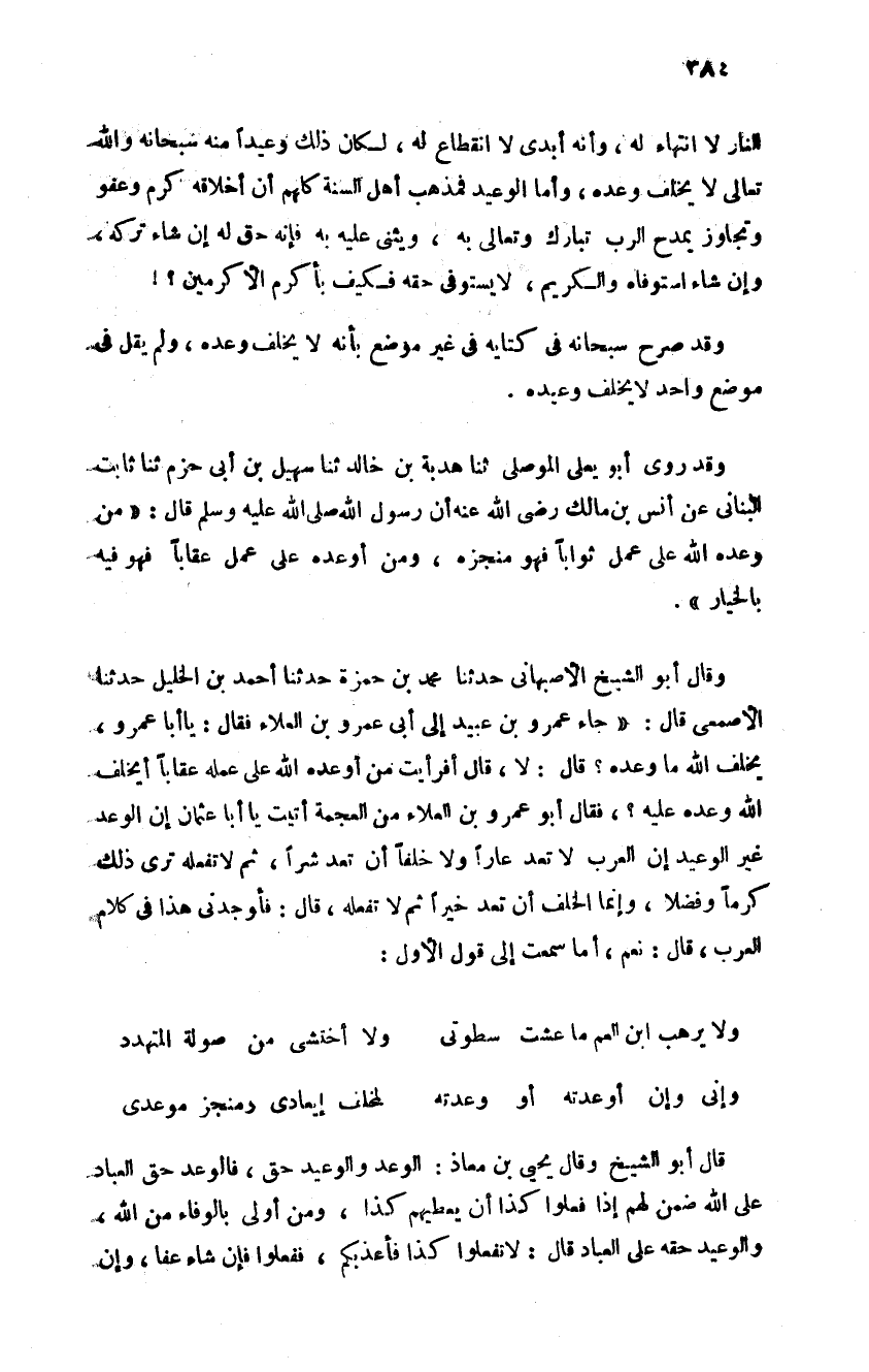 النار لا انتهاء له وانه ابدي لا انقطاع له لكان ذلك وعيدا منه سبحانه وتعالى والله تعالى لا يخلف وعده وأما الوعيد فمذهب أهل السنة كلهم إن إخلافه كرم وعفو وتجاوز يمدح الحرب تبارك وتعالى به ويثنى عليه به فانه حق له إن شاء تركه وإن شاء استوفاه والكريم لا يستوفي حقه فكيف بأكرم الأكرمين وقد صرح سبحانه وتعالى في كتابه في غير موضع بأنه لا يخلف وعده ولم يقل في موضع واحد لا يخلف وعيده وقد روى أبو يعلى الموصلي ثنا هدبة بن خالد حدثنا سهيل بن أبي حزم ثنا ثابت البنائي عن أنس بن مالك رضي الله عنه إن رسول الله قال من وعده الله على عمل ثوابا فهو منجزه ومن واعده على عمل عقابا فهو فيه بالخيار وقال أبو الشيخ الأصبهاني ثنا محمد بن حمزة ثنا احمد بن الخليل ثنا الأصمعي قال جاء عمرو بن عبيد إلى أبي عمرو بن العلاء فقال يا أبا عمرو يخلف الله ما وعده قال لا قال أفرأيت من أوعده الله على عمله عقابا أيخلف الله وعده عليه فقال أبو عمرو بن العلاء من العجمة أتيت يا أبا عثمان إن الوعد غير الوعيد إن العرب لا تعد عارا ولا خلفا إن تعد شرا ثم لا تفعله ترى ذلك كرما وفضلا وإنما الخلف إن تعد خيرا ثم لا تفعله قال فأوجدني هذا في كلام العرب قال نعم أما سمعت إلى قول الأول: