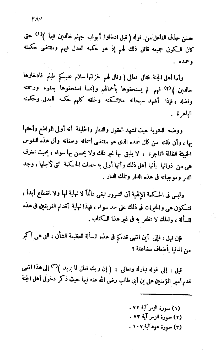 حسن حذف الفاعل من قوله {قِيلَ ادْخُلُوا أبوابَ جَهَنَّمَ خَالِدِينَ فِيهَا} حتى كان الكون كله قائل ذلك لهم إذ هو حكمه العدل فيهم ومقتضى حكمته وحمده وأما أهل الجنة فقال تعالى: {وَقَالَ لَهُمْ خَزَنَتُهَا سَلامٌ عَلَيْكُمْ طِبْتُمْ فَادْخُلُوهَا خَالِدِينَ} فهم لم يستحقوها بأعمالهم وإنما استحقوها بعفوه ورحمته وفضله فإذا اشهد سبحانه وتعالى ملائكته وخلقه كلهم حكمه العدل وحكمته الباهرة وضعه العقوبة حيث تشهد العقول والفطر والخليقة أنه أولى المواضع وأحقها بها وإن ذلك من كمال حمده الذي هو مقتضى أسمائه وصفاته وإن هذه النفوس الخبيثة الظالمة الفاجرة لا يليق بها غير ذلك ولا يحسن بها سواه بحيث تعترف بها هي من ذواتها بأنها أهل ذلك وإنها أولى به حصلت الحكمة التي لأجلها وجد الشر وموجباته في هذه الدار وتلك الدار وليس في الحكمة الإلهية إن الشرور تبقى دائما لا نهاية لها ولا انقطاع أبدا فتكون هي والخيرات في ذلك على حد سواء فهذا نهاية أقدام الفريقين في هذه المسألة ولعلك لا تظفر به في غير هذا الكتاب فان قيل فإلي أين أنهى قدمكم في هذه المسألة العظيمة الشأن التي هي اكبر من الدنيا بأضعاف مضاعفة قيل إلى قوله تبارك وتعالى {إِنَّ رَبَكَ فَعَّالٌ لِمَا يُرِيدُ} وإلى هنا قدم أمير المؤمنين علي بن أبي طالب رضي الله عنه فيها حيث ذكر دخول أهل الجنة