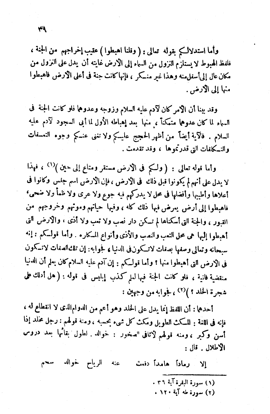 وأما استدلالكم بقوله تعالى: {وقلنا أهبطوا} عقيب إخراجهم من الجنة فلفظ الهبوط لا يستلزم النزول من السماء إلى الأرض غايته أن يدل على النزول من مكان عال إلى أسفل منه وهذا غير منكر فإنها كانت جنة في أعلى الأرض فأهبطوا منها إلى الأرض.