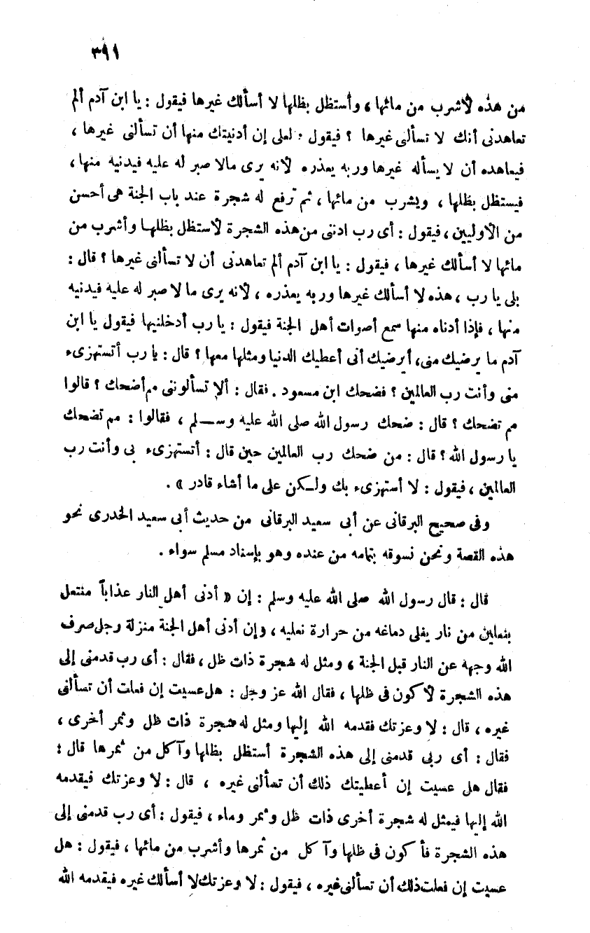 من هذه الشجرة استظل بظلها واشرب من مائها فيقول الله تبارك وتعالى يا ابن آدم لعلي إن أعطيتكها سألتني غيرها فيقول لا يا رب ويعاهده إن لا يسأله شيئا غيرها وربه يعذره لأنه يرى ما لا صبر له عليه فيدنيه منها فيستظل بظلها ويشرب من مائها ثم ترتفع له شجرة هي أحسن من الأولى فيقول يا رب أدنني من هذه لا شرب من مائها واستظل بظلها لا أسالك غيرها فيقول يا ابن آدم ألم تعاهدني انك لا تسألني غيرها فيقول لعلي إن أدنيتك منها إن تسألني غيرها فيعاهده إن لا يسأله غيرها وربه يعذره لأنه يرى ما لا صبر له عليه فيدنيه منها فيستظل بظلها ويشرب من مائها ثم ترفع له شجرة عند باب الجنة هي أحسن من الأوليين فيقول أي رب أدنني من هذه الشجرة لاستظل بظلها واشرب من مائها لا أسألك غيرها فيقول يا ابن آدم ألم تعاهدني إن لا تسألني غيرها قال بلى يا رب هذه لا أسألك غيرها وربه يعذره لأنه يرى ما لا صبر له عليه فيدنيه منها فإذا أدناه منها سمع أصوات أهل الجنة فيقول يا رب ادخلنيها فيقول يا ابن آدم ما يرضيك مني أيرضيك أنى أعطيتك الدنيا ومثلها معها قال يا رب أتستهزئ مني وأنت رب العالمين فضحك ابن مسعود فقال ألا تسألونني مم اضحك قالوا مم تضحك قال ضحك رسول الله فقالوا مم تضحك يا رسول الله صلى الله عليه وسلم قال من ضحك رب العالمين حين قال أتستهزئ بي وأنت رب العالمين فيقول لا استهزئ بك ولكن على ما أشاء قادر وفي صحيح البرقاني عن أبي سعيد البرقاني من حديث أبي سعيد الخدري نحو هذه القصة ونحن نسوقه بتمامه من عنده وهو بإسناد مسلم سواء قال قال رسول الله صلى الله عليه وسلم: "إن أدنى أهل النار عذابا منتعل بنعلين من نار يغلي دماغه من حرارة نعليه وإن أدنى أهل الجنة منزلة رجل صرف الله وجهه عن النار قبل الجنة ومثل له شجرة ذات ظل فقال أي رب قدمني إلى هذه الشجرة لأكون في ظلها فقال الله عز وجل هل عسيت إن فعلت إن تسألني غيره قال لا وعزتك فقدمه الله إليها ومثل له شجرة ذات ظل وثمر أخرى فقال أي رب قدمني إلى هذه الشجرة استظل بظلها وآكل من ثمرها قال فقال هل عسيت إن أعطيتك ذلك إن تسألني غيره قال لا وعزتك لا أسألك غيره فيقدمه الله