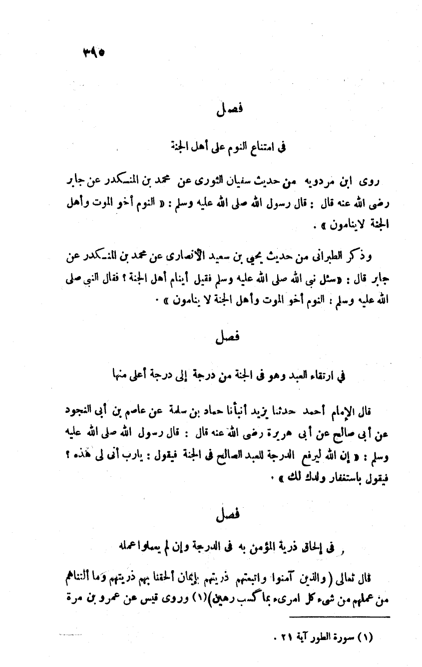 فصل قي امتناع النوم على أهل الجنة روى ابن مردويه من حديث سفيان الثوري عن محمد بن المنكدر عن جابر رضي الله عنه قال قال رسول الله "النوم أخو الموت وأهل الجنة لا ينامون "وذكر الطبراني من حديث يحيى بن سعيد الأنصاري عن محمد ابن المنكدر عن جابر قال سئل نبي الله فقيل أينام أهل الجنة فقال النبي صلى الله عليه وسلم "النوم أخو الموت وأهل الجنة لا ينامون" فصل في ارتقاء العبد وهو في الجنة من درجة إلى درجة أعلى منها قال الإمام احمد ثنا يزيد أنبانا حماد بن سلمة عن عاصم بن أبي النجود عن أبي صالح عن أبي هريرة رضي الله عنه قال قال رسول الله" إن الله ليرفع الدرجة للعبد الصالح في الجنة فيقول يا رب إن لي هذه فيقول باستغفار ولدك لك"