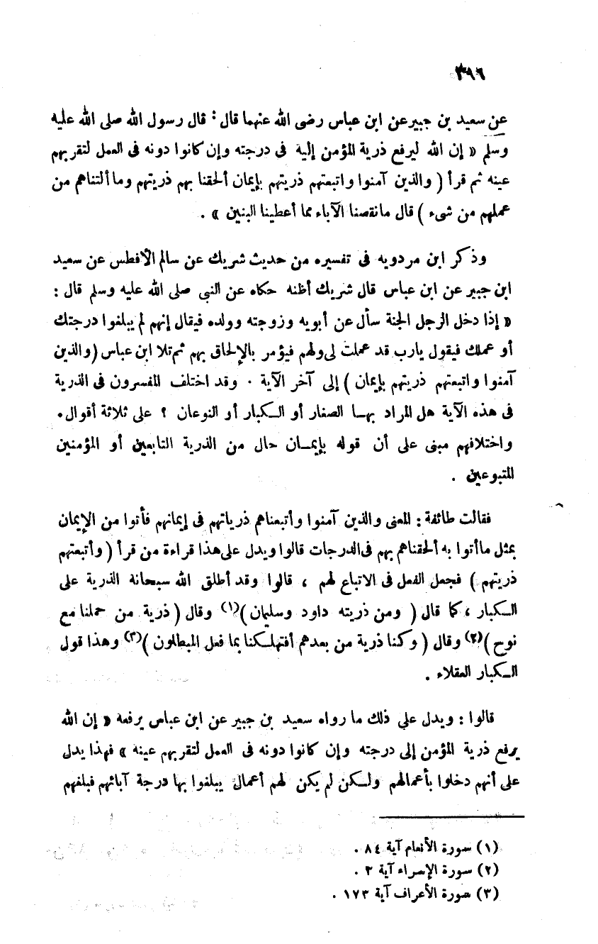 قالوا ويدل على ذلك ما رواه قول سعيد بن جبير عن ابن عباس يرفعه: "إن الله يرفع ذرية المؤمن إلى درجته وإن كانوا دونه في العمل لتقر بهم عينه فهذا يدل على أنهم دخلوا الجنة بأعمالهم ولكن لم يكن لهم أعمال يبلغوا بها درجة آبائهم فبلغهم