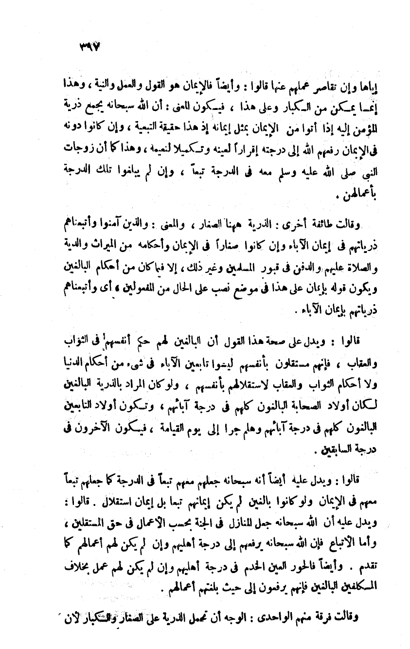 إياها وإن تقاصر عملهم عنها قالوا أيضا فالأيمان هو القول والعمل والنية وهذا إنما يمكن من الكبار وعلى هذا فيكون المعنى إن الله سبحانه يجمع ذرية المؤمن إليه إذا أتوا من الإيمان بمثل إيمانه إذ هذا حقيقة التبعية وإن كانوا دونه في الإيمان رفعهم الله إلى درجته إقرارا لعينه وتكميلا لنعيمه وهذا كما إن زوجات النبي صلى الله عليه وسلم معه في الدرجة تبعا وإن لم يبلغوا تلك الدرجة بأعمالهن وقالت طائفة أخرى الذرية هاهنا الصغار والمعنى والذين آمنوا واتبعناهم ذرياتهم في إيمان الآباء والذرية تتبع الآباء وإن كانوا صغارا في الإيمان وإحكامه من الميراث والدية والصلاة عليهم والدفن في قبور المسلمين وغير ذلك ألا فيما كان من أحكام البالغين ويكون قوله بإيمان على هذا في موضع نصب على الحال من المفعولين أي واتبعناهم ذرياتهم بإيمان الآباء قالوا ويدل على صحة هذا القول البالغين لهم حكم أنفسهم في الثواب والعقاب فإنهم مستقلون بأنفسهم ليسوا تابعين الآباء في شيء من أحكام الدنيا ولا أحكام الثواب والعقاب لاستقلالهم بأنفسهم ولو كان المراد بالذرية البالغين لكن أولاد الصحابة البالغون كلهم في درجة آبائهم وتكون أولاد التابعين البالغون كلهم في درجة آبائهم وهلم جرا إلى يوم القيامة فيكون الآخرون في درجة السابقين قالوا ويدل عليه أيضا أنه سبحانه جعلهم معهم تبعا في الدرجة كما جعلهم تبعا معهم في الإيمان ولو كانوا بالغين لم يكن إيمانهم تبعا بل إيمان استقلال قالوا ويدل عليه إن الله سبحانه وتعالى جعل المنازل في الجنة بحسب الأعمال في حق المستقلين وأما الإتباع فان الله سبحانه وتعالى يرفعهم إلى درجة أهليهم وإن لم يكن لهم أعمالهم كما تقدم وأيضا فالحور العين والخدم في درجة أهليهم وان لم يكن لهم عمل بخلاف المكلفين البالغين فإنهم يرفعون إلى حيث بلغتهم أعمالهم
