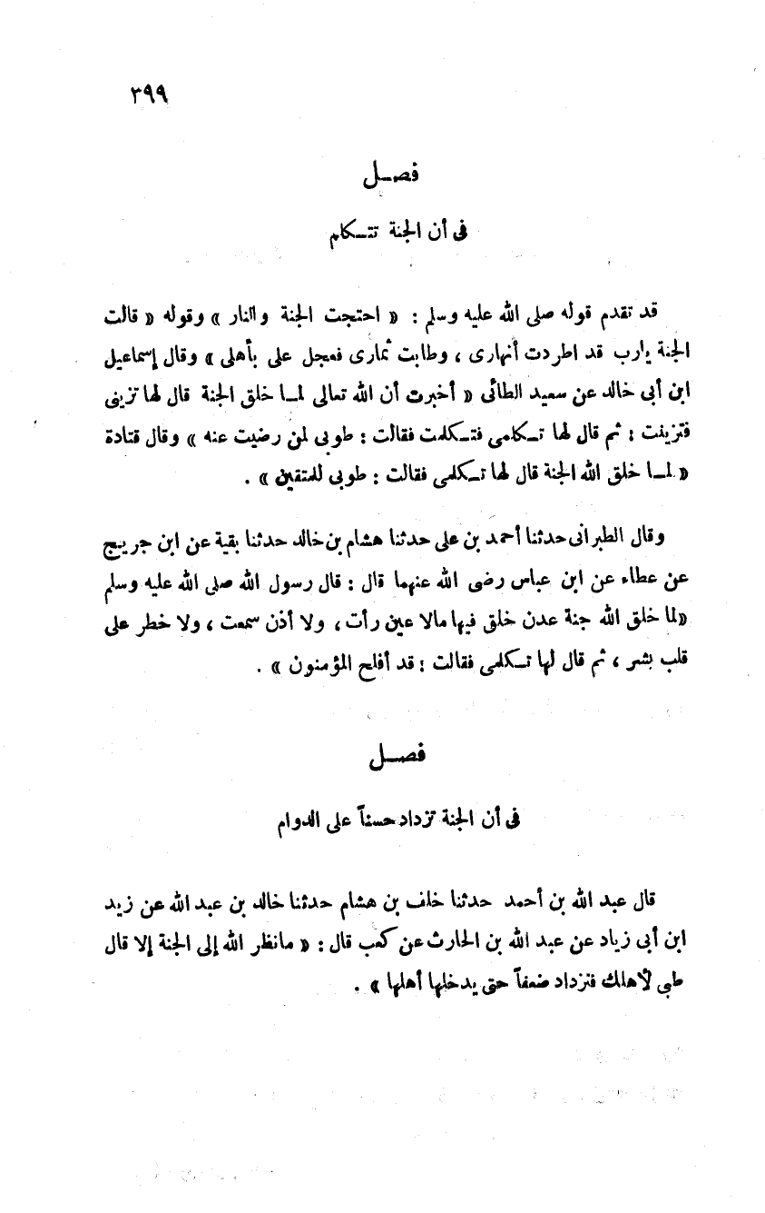 فصل في إن الجنة تزداد حسنا على الدوام قال عبد الله بن احمد ثنا خلف بن هشام ثنا خالد بن عبد الله عن يزيد بن أبي زياد عن عبد الله بن الحارث عن كعب قال: ما نظر الله إلى الجنة ألا قال طيبي لأهلك فتزداد ضعفا حتى يدخلها أهلها