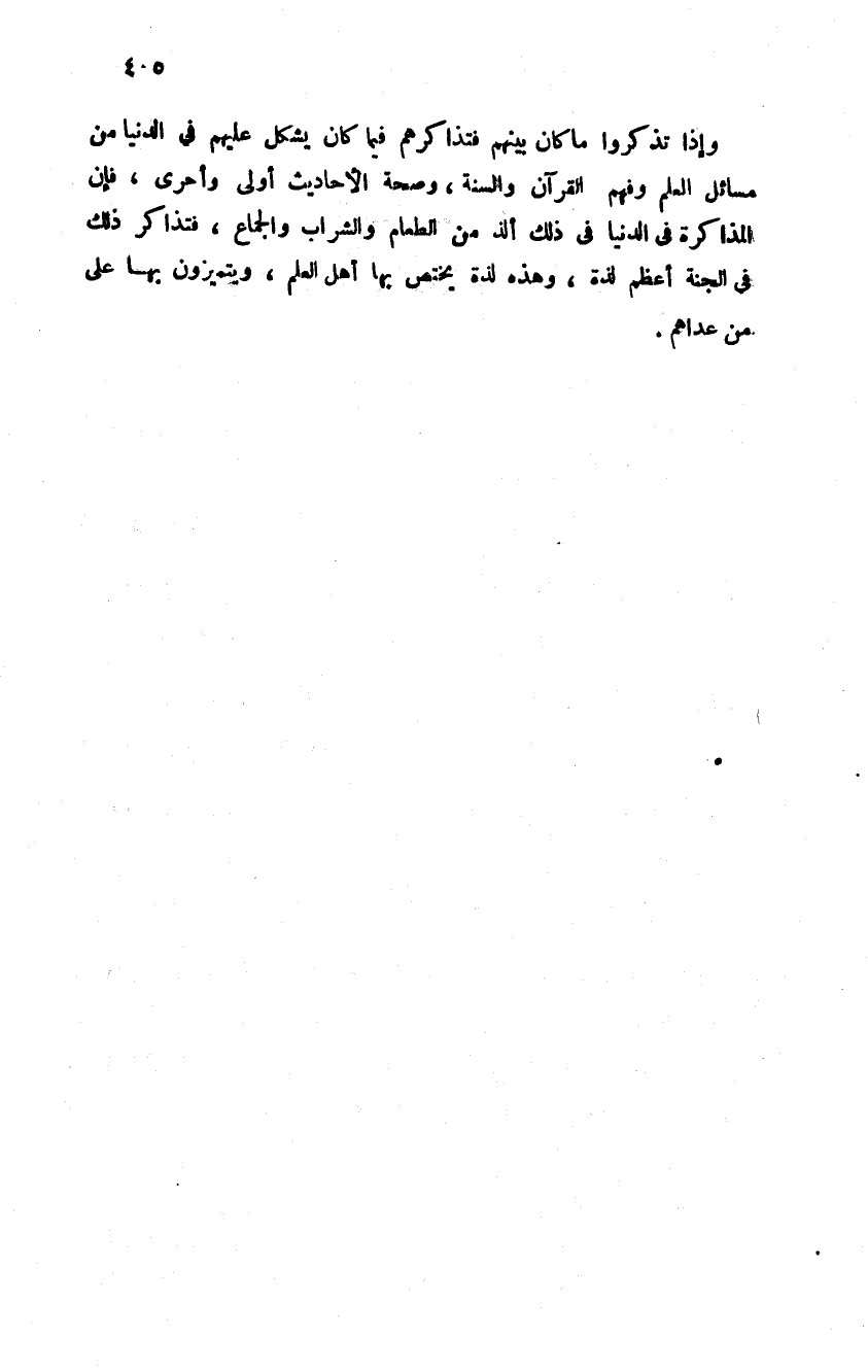 وإذا تذاكروا ما كان بينهم فتذاكرهم فيما كان يشكل عليهم في الدنيا من مسائل العلم وفهم القرآن والسنة وصحة الأحاديث أولى وأحرى فان المذاكرة في الدنيا في ذلك ألذ من الطعام والشراب والجماع فتذاكر في الجنة أعظم لذة وهذه لذة يختص بها أهل العلم ويتميزون بها على من عداهم