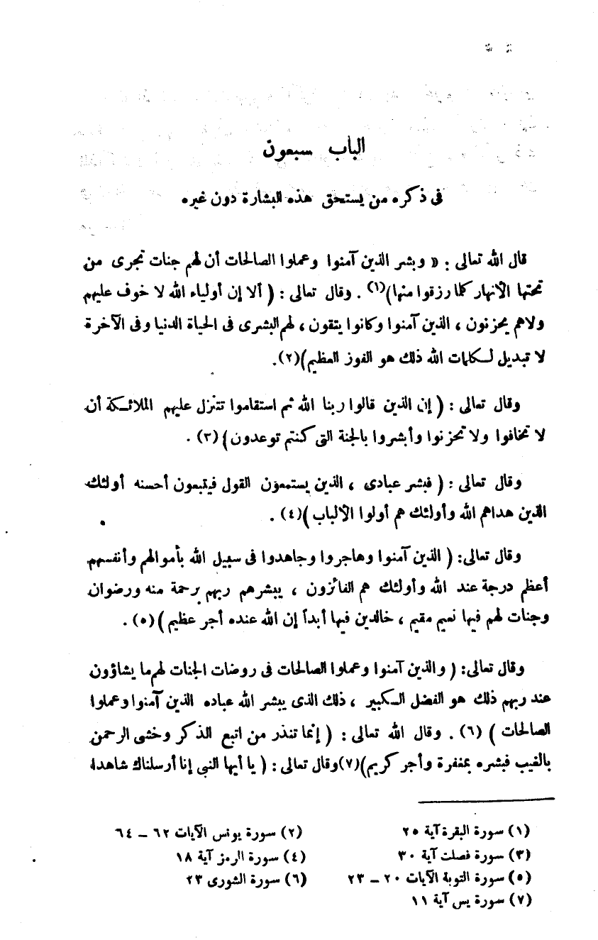 قال الله تعالى: {وَبَشِّرِ الَّذِينَ آمَنُوا وَعَمِلُوا الصَّالِحَاتِ أَنَّ لَهُمْ جَنَّاتٍ تَجْرِي مِنْ تَحْتِهَا الْأَنْهَارُ كُلَّمَا رُزِقُوا مِنْهَا} وقال تعالى: {أَلا إِنَّ أَوْلِيَاءَ اللَّهِ لا خَوْفٌ عَلَيْهِمْ وَلا هُمْ يَحْزَنُونَ الَّذِينَ آمَنُوا وَكَانُوا يَتَّقُونَ لَهُمُ الْبُشْرَى فِي الْحَيَاةِ الدُّنْيَا وَفِي الْآخِرَةِ لا تَبْدِيلَ لِكَلِمَاتِ اللَّهِ ذَلِكَ هُوَ الْفَوْزُ الْعَظِيمُ} وقال تعالى: {إِنَّ الَّذِينَ قَالُوا رَبُّنَا اللَّهُ ثُمَّ اسْتَقَامُوا تَتَنَزَّلُ عَلَيْهِمُ الْمَلائِكَةُ أَلَّا تَخَافُوا وَلا تَحْزَنُوا وَأَبْشِرُوا بِالْجَنَّةِ الَّتِي كُنْتُمْ تُوعَدُونَ} وقال تعالى: {فَبَشِّرْ عِبَادِ الَّذِينَ يَسْتَمِعُونَ الْقَوْلَ فَيَتَّبِعُونَ أَحْسَنَهُ أُولَئِكَ الَّذِينَ هَدَاهُمُ اللَّهُ وَأُولَئِكَ هُمْ أُولُو الأَلْبَابِ} وقال تعالى: {الَّذِينَ آمَنُوا وَهَاجَرُوا وَجَاهَدُوا فِي سَبِيلِ اللَّهِ بِأَمْوَالِهِمْ وَأَنْفُسِهِمْ أَعْظَمُ دَرَجَةً عِنْدَ اللَّهِ وَأُولَئِكَ هُمُ الْفَائِزُونَ يُبَشِّرُهُمْ رَبُّهُمْ بِرَحْمَةٍ مِنْهُ وَرِضْوَانٍ وَجَنَّاتٍ لَهُمْ فِيهَا نَعِيمٌ مُقِيمٌ خَالِدِينَ فِيهَا أَبَداً إِنَّ اللَّهَ عِنْدَهُ أَجْرٌ عَظِيمٌ} وقال تعالى: {وَالَّذِينَ آمَنُوا وَعَمِلُوا الصَّالِحَاتِ فِي رَوْضَاتِ الْجَنَّاتِ لَهُمْ مَا يَشَاءُونَ عِنْدَ رَبِّهِمْ ذَلِكَ هُوَ الْفَضْلُ الْكَبِيرُ ذَلِكَ الَّذِي يُبَشِّرُ اللَّهُ عِبَادَهُ الَّذِينَ آمَنُوا وَعَمِلُوا الصَّالِحَاتِ} وقال تعالى: {إِنَّمَا تُنْذِرُ مَنِ اتَّبَعَ الذِّكْرَ وَخَشِيَ الرَّحْمَنَ بِالْغَيْبِ فَبَشِّرْهُ بِمَغْفِرَةٍ وَأَجْرٍ كَرِيمٍ} وقال تعالى: {يَا أَيُّهَا النَّبِيُّ إِنَّا أَرْسَلْنَاكَ شَاهِداً