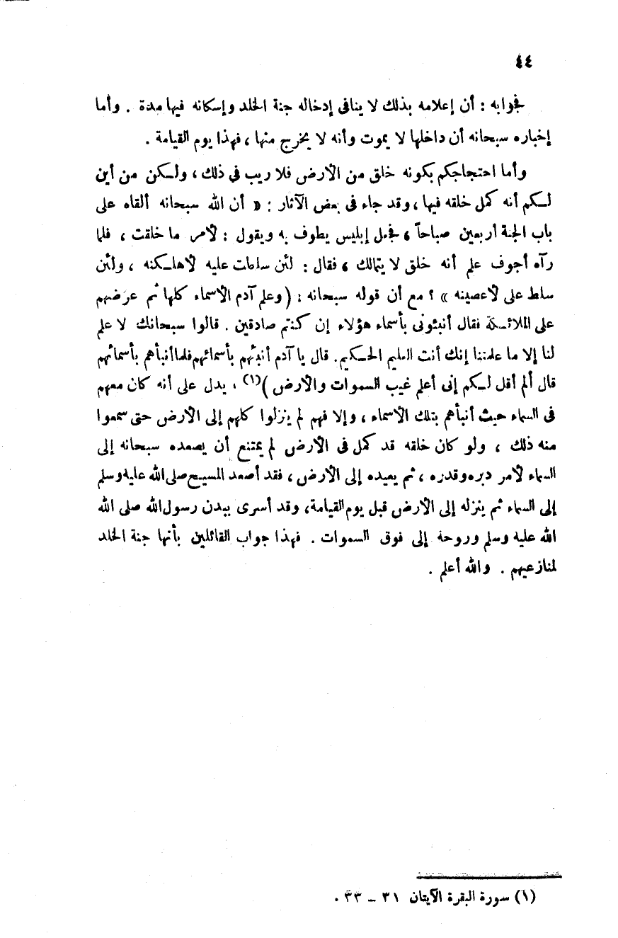 وأما احتجاجكم بكونه خلق من الأرض فلا ريب في ذلك ولكن من أين لكم أنه كمل خلقه فيها وقد جاء في بعض الآثار أن الله سبحانه ألقاه على باب الجنة أربعين صباحا فجعل إبليس يطوف به ويقول لأمر ما خلقت فلما رآه أجوف علم أنه خلق لا يتمالك فقال لئن سلطت عليه لأهلكنه ولئن سلط علي لا عصينه مع أن قوله سبحانه {وَعَلَّمَ آدَمَ الأَسْمَاءَ كُلَّهَا ثُمَّ عَرَضَهُمْ عَلَى الْمَلائِكَةِ فَقَالَ أَنْبِئُونِي بِأَسْمَاءِ هَؤُلاءِ إِنْ كُنْتُمْ صَادِقِينَ قَالُوا سُبْحَانَكَ لا عِلْمَ لَنَا إِلاَّ مَا عَلَّمْتَنَا إِنَّكَ أَنْتَ الْعَلِيمُ الْحَكِيمُ قَالَ يَا آدَمُ أَنْبِئْهُمْ بِأَسْمَائِهِمْ فَلَمَّا أَنْبَأَهُمْ بِأَسْمَائِهِمْ قَالَ أَلَمْ أَقُلْ لَكُمْ إِنِّي أَعْلَمُ غَيْبَ السَّمَاوَاتِ وَالأَرْضِ وَأَعْلَمُ مَا تُبْدُونَ وَمَا كُنْتُمْ تَكْتُمُونَ} يدل على أنه كان معهم في السماء حيث أنبأهم بتلك الأسماء وإلا فهم لم ينزلوا كلهم إلى الأرض حتى سمعوا منه ذلك ولو كان خلقه قد كمل في الأرض لم يمتنع أن يصعده سبحانه الى السماء لأمر دبره وقدره ثم يعيده إلى الأرض فقد أصعد المسيح إلى السماء ثم ينزله إلى الأرض قبل يوم القيامة وقد أسرى ببدن رسول الله وروحه إلى فوق السموات فهذا جواب القائلين بأنها جنة الخلد لمنازعيهم والله أعلم.
