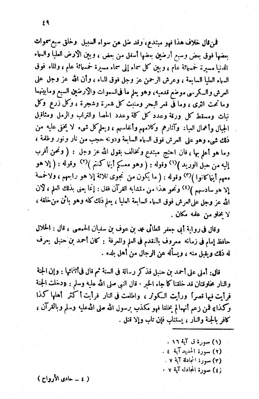 فمن قال خلاف هذا فهو مبتدع وقد ضل عن سواء السبيل وخلق سبع سموات بعضها فوق بعض وسبع أرضين بعضها أسفل من بعض وبين الأرض العليا والسماء الدنيا مسيرة خمسمائة عام وبين كل سماء إلى سماء مسيرة خمسمائة عام والماء فوق السماء العليا السابعة وعرش الرحمن عز وجل فوق الماء وأن الله عز وجل على العرش والكرسي موضع قدميه وهو يعلم ما في السموات والأرضين السبع وما بينهما وما تحت الثرى وما في قعر البحر ومنبت كل شعرة وشجرة وكل زرع وكل نبات ومسقط كل ورقة وعدد كل كلمة وعدد الحصا والتراب والرمل ومثاقيل الجبال وأعمال العباد وآثارهم وكلامهم وأنفاسهم ويعلم كل شيء لا يخفى عليه من ذلك شيء وهو على العرش فوق السماء السابعة ودونه حجب من نار ونور وظلمة وما هو أعلم بها فإن احتج مبتدع ومخالف بقول الله عز وجل: {ونحن أقرب إليه من حبل الوريد} وقوله {وهو معكم أينما كنتم} وقوله {إلا هو معهم أينما كانوا} وقوله {ما يكون من نجوى ثلاثة إلا هو رابعهم ولا خمسة إلا هو سادسهم} ونحو هذا من متشابه القرآن فقل إنما يعني بذلك العلم لأن الله عز وجل على العرش فوق السماء السابعة العليا يعلم ذلك كله وهو بائن من خلقه لا يخلو من علمه مكان