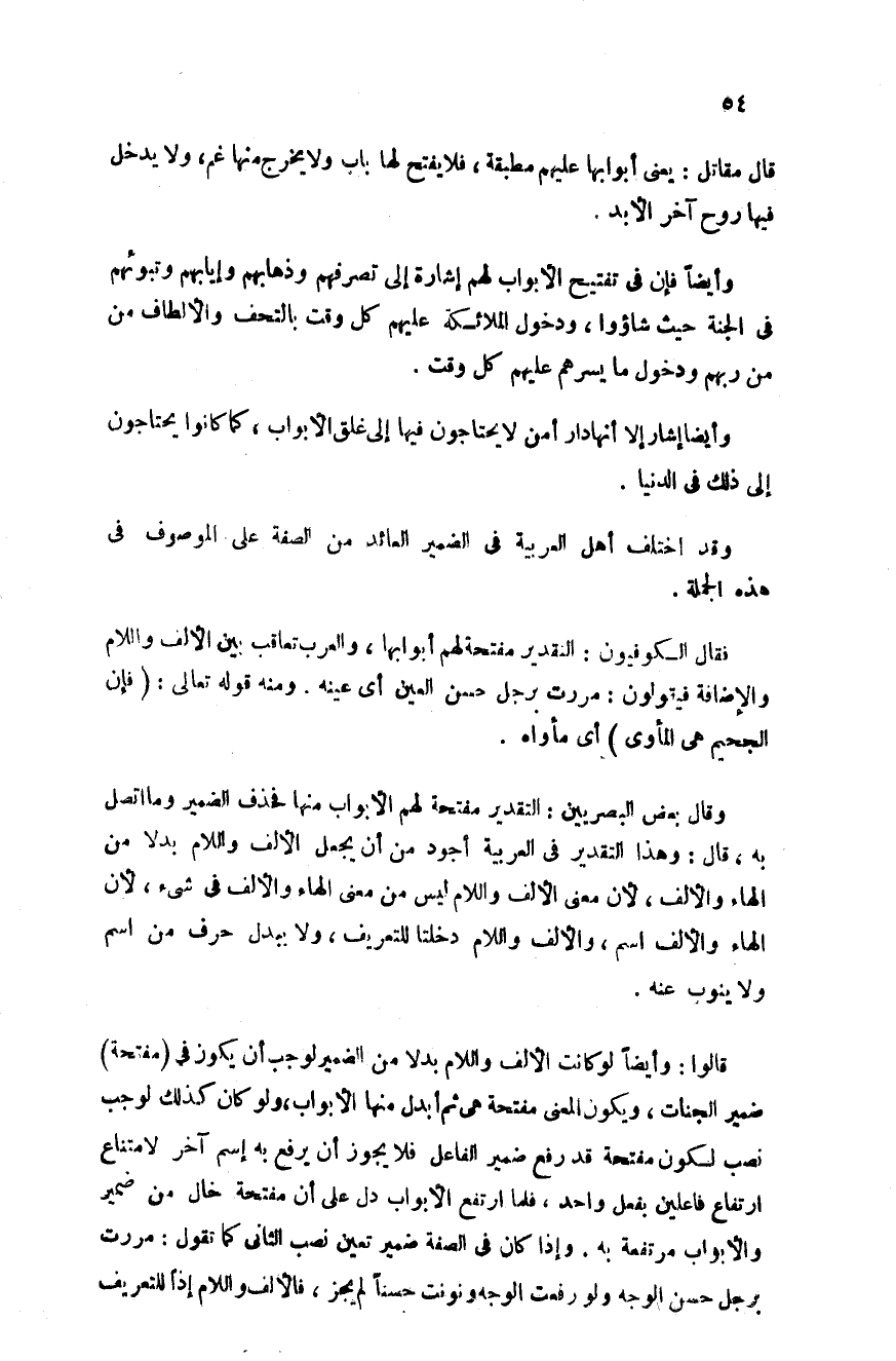 قالوا وأيضا لو كانت الألف واللام بدلا من الضمير لوجب أن يكون في مفتحة ضمير الجنات ويكون معنى "مفتحة" هي ثم أبدل منها الأبواب ولو كان كذلك لوجب نصب الأبواب لكون "مفتحة" قد رفع ضمير الفاعل فلا يجوز أن يرفع به اسم آخر لامتناع ارتفاع فاعلين بفعل واحد فلما ارتفع "الأبواب" دل على أن "مفتحة" خال من ضمير و"الأبواب" مرتفعة به وإذا كان في الصفة ضمير تعين نصب الثاني كما تقول مررت برجل حسن الوجه ولو رفعت الوجه ونونت حسنا لم يجز فالألف واللام إذا للتعريف