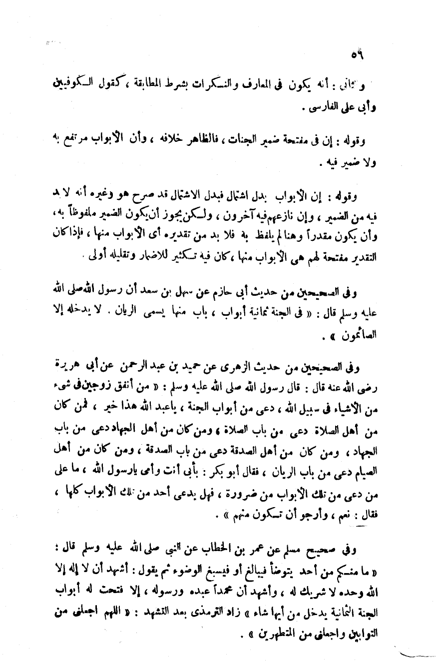 وفي الصحيحين من حديث أبي حازم عن سهل بن سعد أن رسول الله قال: "في الجنة ثمانية أبواب باب منها يسمى الريان" لا يدخله إلا الصائمون" وفي الصحيحين من حديث الزهري عن حميد بن عبد الرحمن عن أبي هريرة رضي الله عنه قال قال رسول الله " من أنفق زوجين في شيء من الأشياء في سبيل الله دعى من أبواب الجنة يا عبد الله هذا خير فمن كان من أهل الصلاة دعى من باب الصلاة ومن كان من أهل الجهاد دعى من باب الجهاد ومن كان من أهل الصدقة دعى من باب الصدقة ومن كان من أهل الصيام دعي من باب الريان" فقال أبو بكر بأبي أنت وأمي يا رسول الله صلى الله عليه وسلم ما على من دعي من تلك الأبواب من ضرورة فهل يدعى أحد من تلك الأبواب كلها فقال نعم وأرجوا أن تكون منهم"