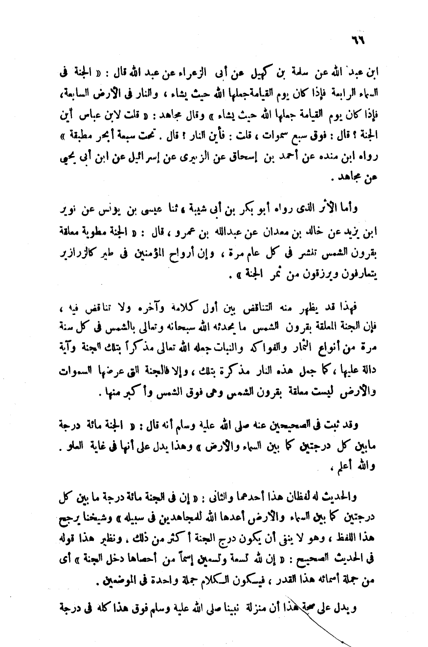 بن عبد الله عن سلمة بن كهيل عن أبي الزعراء عن عبد الله قال: "الجنة في السماء الرابعة فإذا كان يوم القيامة جعلها الله حيث يشاء والنار في الأرض السابعة فإذا كان يوم القيامة جعلها الله حيث يشاء".