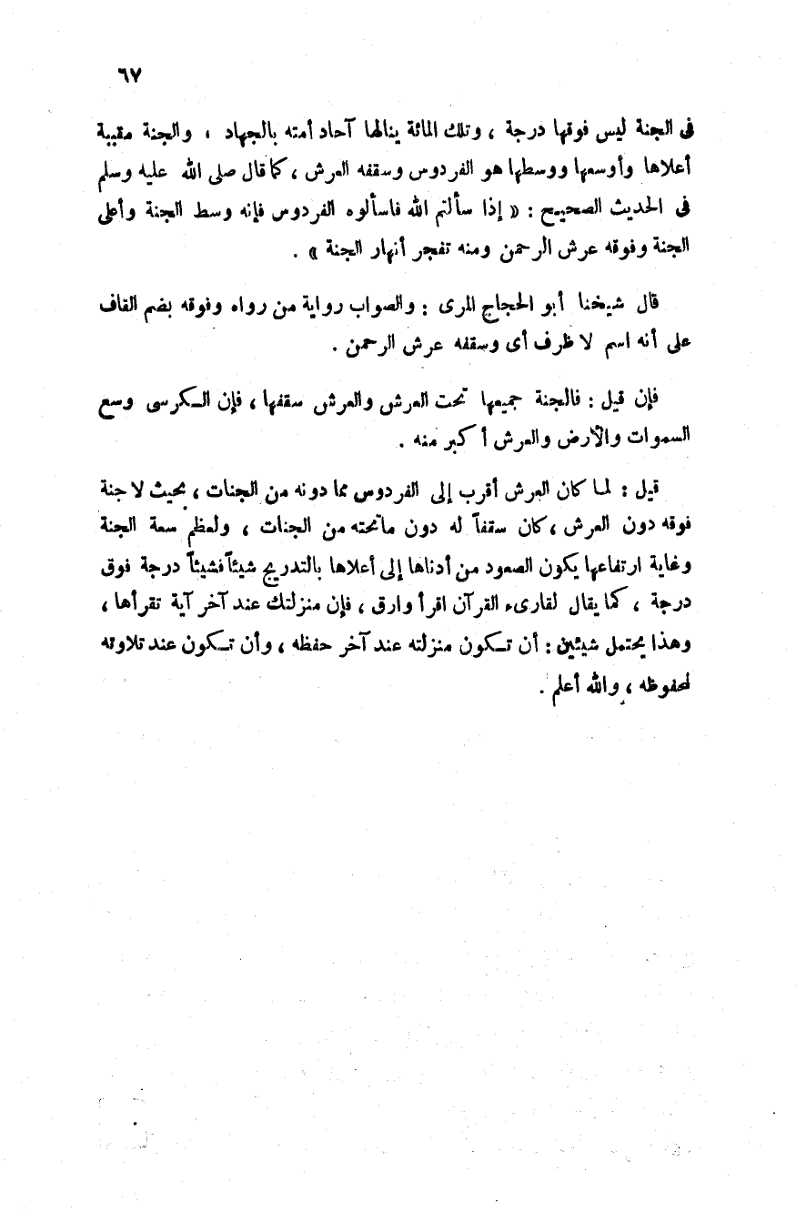 قيل: لما كان العرش أقرب إلى الفردوس مما دونه من الجنات بحيث لا جنة فوقه دون العرش كان سقفا له دون ما تحته من الجنات ولعظم سعة الجنة وغاية ارتفاعها يكون الصعود من أدناها إلى أعلاها بالتدريج شيئا فشيئا درجة فوق درجة كما يقال لقاريء القرآن "اقرأ وارق فإن منزلتك عند آخر آية تقرأها" وهذا يحتمل شيئين أن تكون منزلته عند آخر حفظه وأن تكون عند آخر تلاوته لمحفوظة والله أعلم.