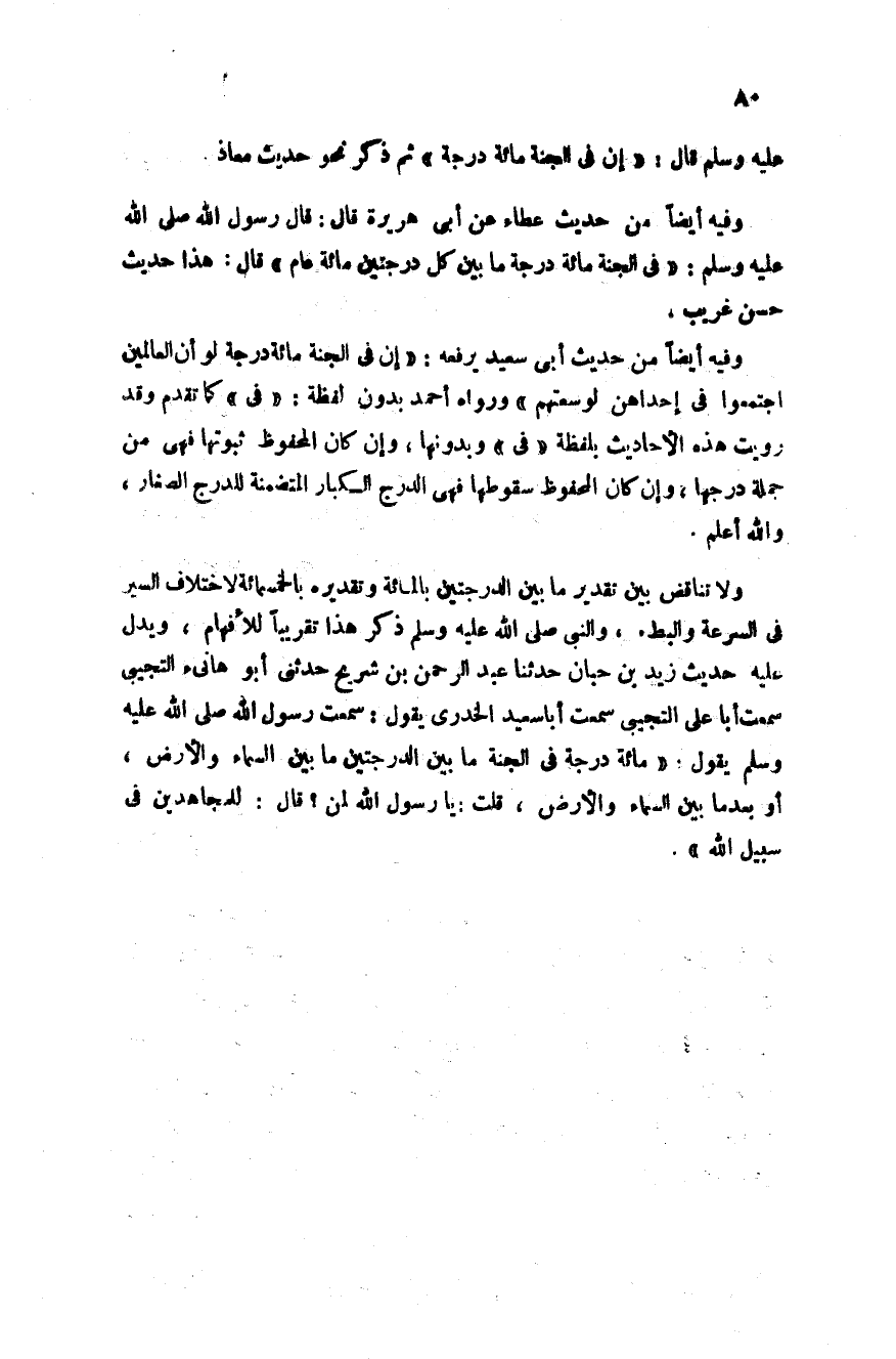 عليه وسلم قال: "إن في الجنة مائة درجة ثم "ذكر نحو حديث معاذ وفيه أيضا من حديث عطاء عن أبي هريرة قال قال رسول الله في الجنة مائة درجة ما بين كل درجتين مائة عام قال هذا حديث حسن غريب