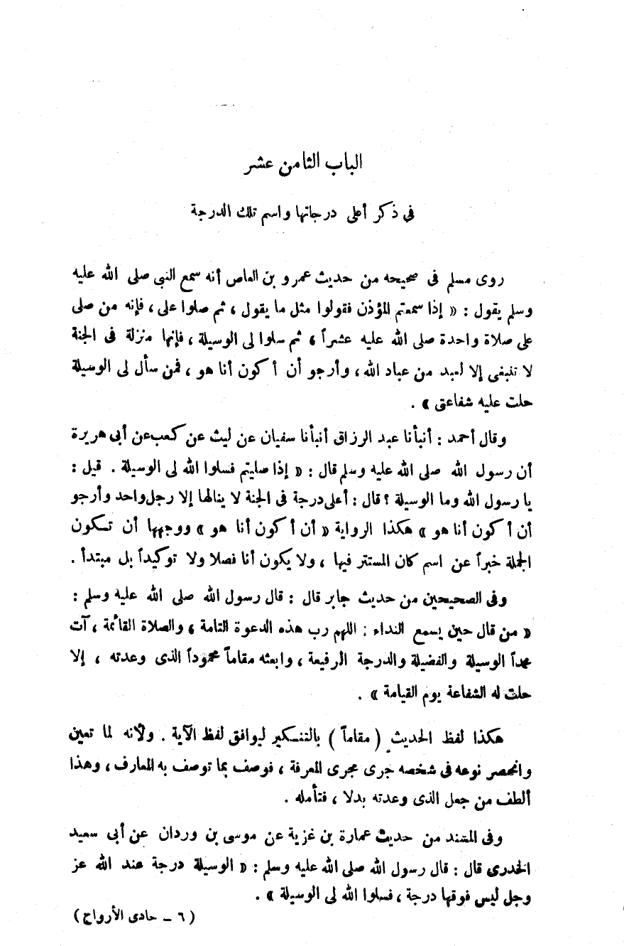 روى مسلم في صحيحه من حديث عمرو بن العاص أنه سمع النبي صلى الله عليه وسلم يقول: " إذا سمعتم المؤذن فقولوا مثل ما يقول ثم صلوا عليّ فأنه من صلى علي صلاة واحدة صلى الله عليه عشرا ثم سلوا لي الوسيلة فإنها منزلة في الجنة لا تنبغي إلا لعبد من عباد الله وأرجو أن أكون أنا هو فمن سأل لي الوسيلة حلت عليه شفاعتي"
