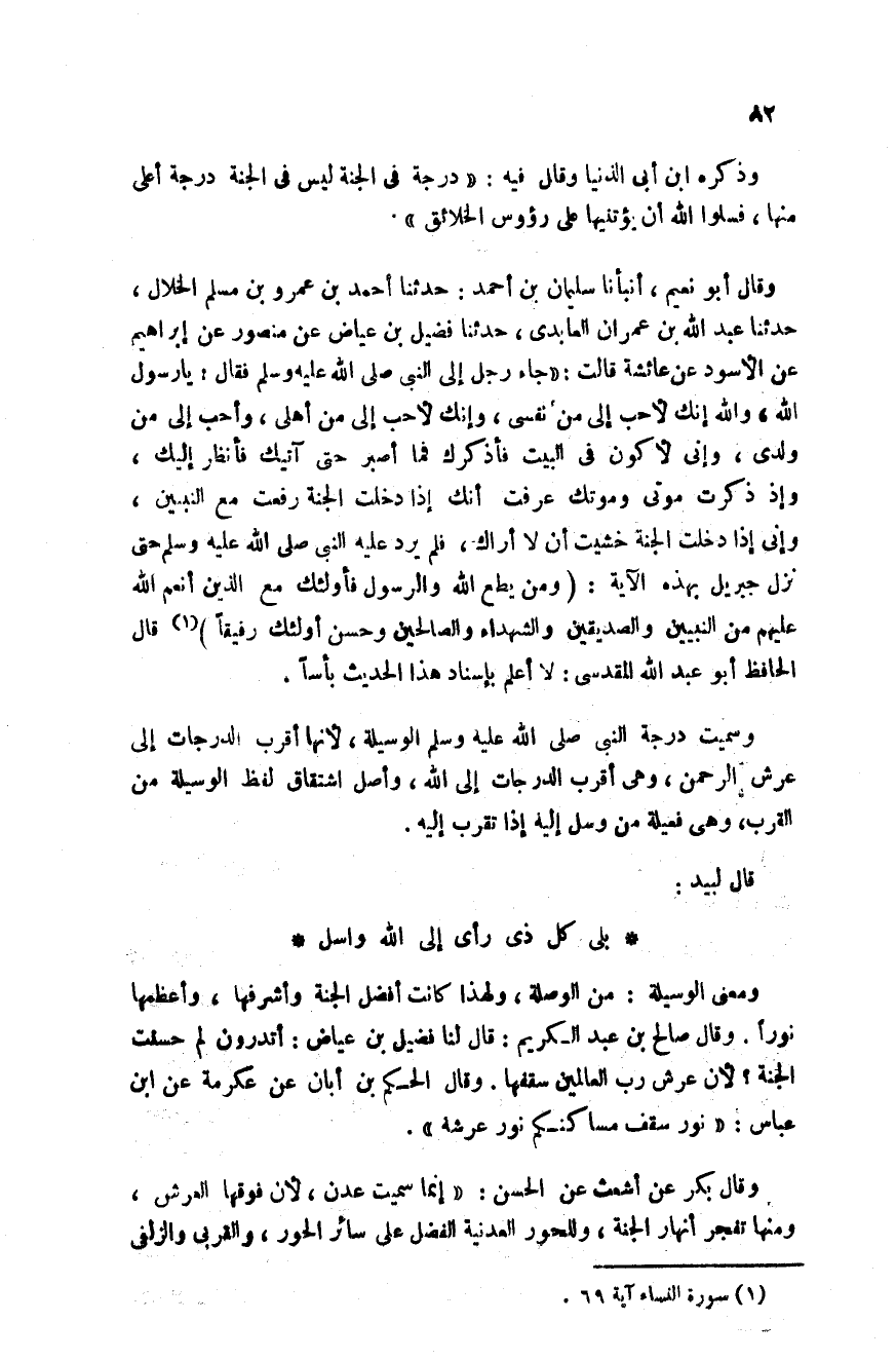 وقال أبو نعيم أنبأنا سليمان بن أحمد حدثنا أحمد بن عمرو بن سلم الخلال حدثنا عبد الله بن عمران العبادي حدثنا فضيل بن عياض عن منصور عن إبراهيم عن الأسود عن عائشة قالت: جاء رجل إلى النبي صلى الله عليه وسلم فقال يا رسول الله صلى الله عليه وسلم والله أنك لأحب إلي من نفسي وإنك لأحب إلي من أهلي وأحب إلي من ولدي وأحب إلي من كذا وإني لأكون في البيت فأذكرك فما أصبر حتى آتيك فأنظر إليك وإذا ذكرت موتي وموتك عرفت أنك إذا دخلت الجنة رفعت مع النبين وإني إذا دخلت الجنة خشيت أن لا أراك فلم يرد عليه النبي صلى الله عليه وسلمحتى نزل جبريل بهذا الآية {وَمَنْ يُطِعِ اللَّهَ وَالرَّسُولَ فَأُولَئِكَ مَعَ الَّذِينَ أَنْعَمَ اللَّهُ عَلَيْهِمْ مِنَ النَّبِيِّينَ وَالصِّدِّيقِينَ وَالشُّهَدَاءِ وَالصَّالِحِينَ وَحَسُنَ أُولَئِكَ رَفِيقاً} قال الحافظ أبو عبد الله المقدسي لا أعلم بإسناد هذا الحديث بأسا