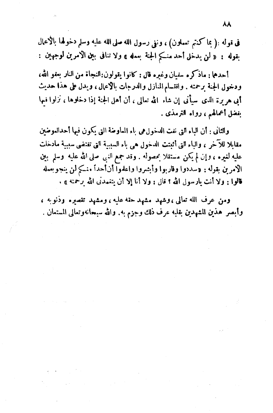 والثاني: أن الباء التي نفت الدخول هي باء المعاوضة التي يكون فيها أحد العوضين مقابلا للآخر والباء التي أثبتت الدخول هي باء السببية التي تقتضي سببية ما دخلت عليه لغيره وأن لم يكن مستقلا بحصوله وقد جمع النبي صلى الله عليه وسلم بين الأمرين بقوله: "سددوا وقاربوا وأبشروا واعلموا أن أحدا منكم لن ينجو بعمله" قالوا: ولا أنت يا رسول الله صلى الله عليه وسلم قال: "ولا أنا ألا أن يتغمدني الله برحمته" ومن عرف الله تعالى وشهد مشهد حقه عليه ومشهد تقصيره وذنوبه وابصر هذين المشهدين بقلبه عرف ذلك وجزم به والله سبحانه وتعالى المستعان.