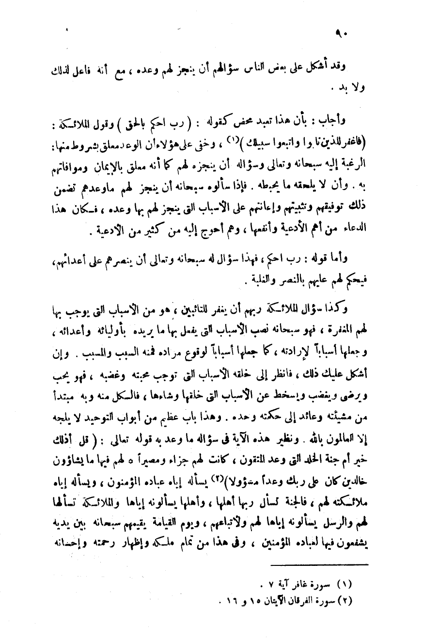 وأجاب بأن هذا تعبد محض كقوله: {رَبِّ احْكُمْ بِالْحَق} وقول الملائكة: {فَاغْفِرْ لِلَّذِينَ تَابُوا وَاتَّبَعُوا سَبِيلَكَ} وخفي على هؤلاء أن الوعد معلق بشروط منها الرغبة إليه سبحانه وتعالى وسؤاله أن ينجزه لهم كما أنه معلق بالإيمان وموافاتهم به وأن لا يلحقه ما يحبطه فإذا سألوه سبحانه أن ينجز لهم ما وعدهم تضمن ذلك توفيقهم وتثبيتهم وإعانتهم على الأسباب التي ينجز لهم بها وعده كان هذا الدعاء من أهم الادعية وأنفعها وهم أحوج إليه من كثير من الادعية