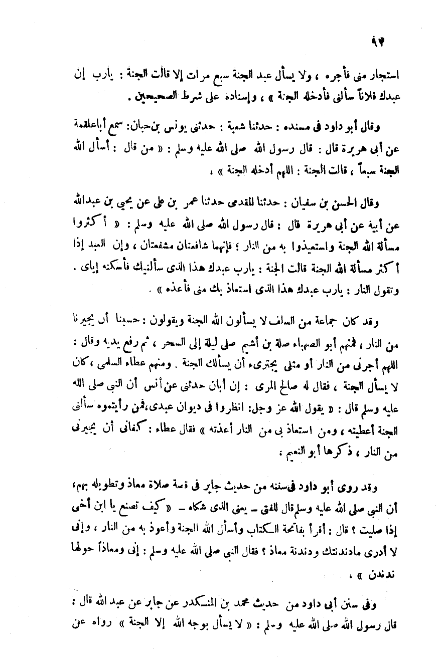 وقال الحسن بن سفيان حدثنا المقدمي حدثنا عمر بن علي عن يحيى بن عبد الله عن أبيه عن أبي هريرة قال قال رسول الله صلى الله عليه وسلم: "أكثروا مسألة الله الجنة واستعيذوا به من النار فأنهما شافعتان مشفعتان وأن العبد إذا أكثر مسألة الله الجنة قالت الجنة يا رب عبدك هذا الذي سألينك فأسكنه إياي وتقول النار يا رب عبدك هذا الذي استعاذ بك مني فاعذه"