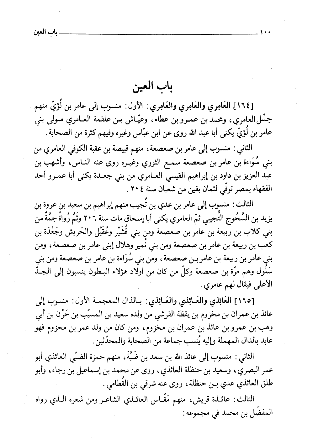 (164) العامري والعامري والعامري الأول مَنْسُوب إِلَى عَامر بن لؤَي مِنْهُم حسل العامري وَمُحَمّد بن عَمْرو بن عَطاء وَعَيَّاش بن عَلْقَمَة العامري مولى بني عَامر بن لؤَي يكنى أَبَا عبد الله روى عَن ابْن عَبَّاس وَغَيره وَفِيهِمْ كَثْرَة من الصَّحَابَة