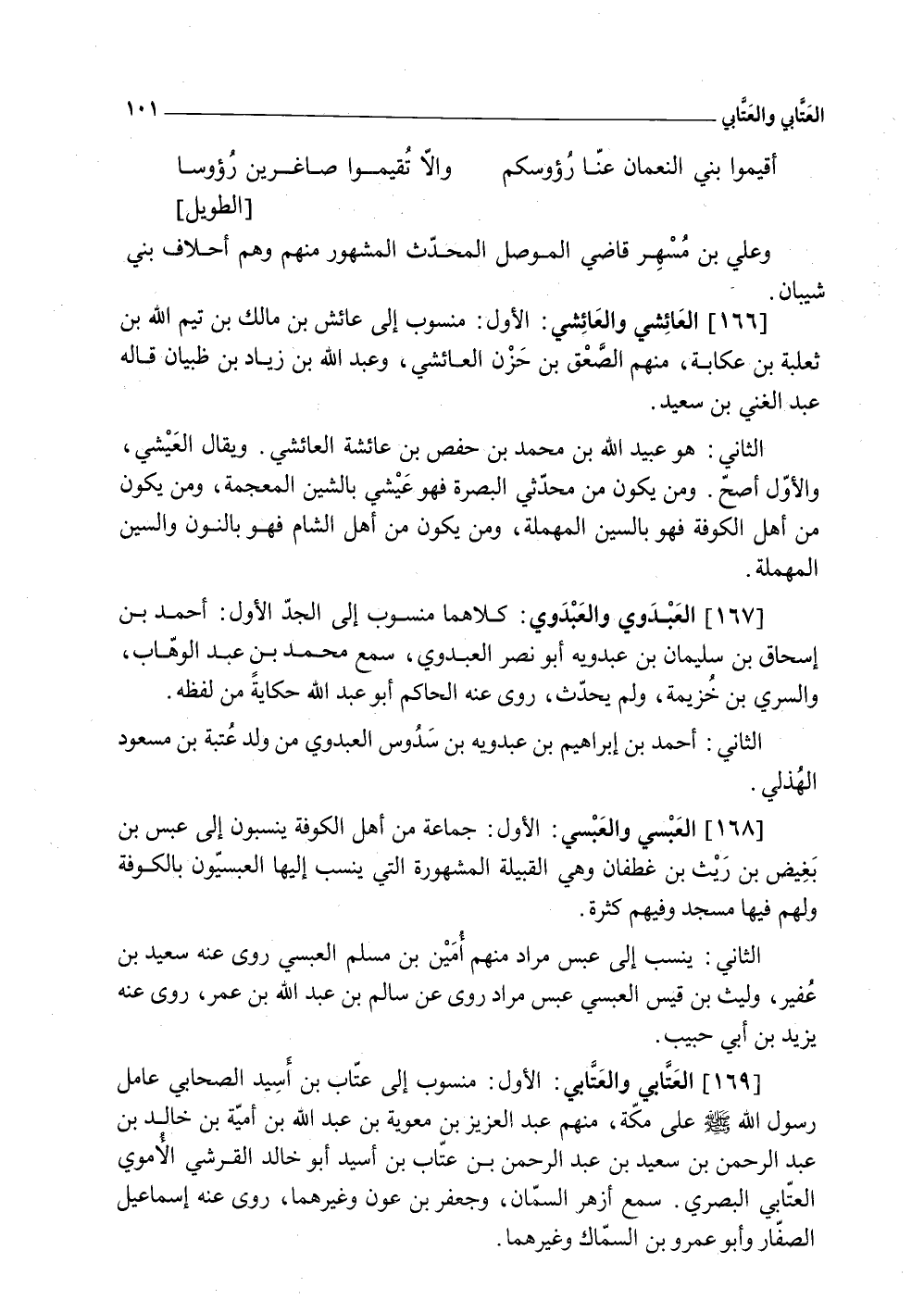 (169) العتابي والعتابي الأول مَنْسُوب إِلَى عتاب بن أسيد الصَّحَابِيّ عَامل رَسُول الله صلى الله عَلَيْهِ وَسلم على مَكَّة مِنْهُم عبد الْعَزِيز بن معوية بن عبد الله بن أُميَّة بن خَالِد بن عبد الرَّحْمَن بن سعيد بن عبد الرَّحْمَن بن عتاب بن أسيد أَبُو خَالِد الْقرشِي الْأمَوِي العتابي الْبَصْرِيّ سمع أَزْهَر السمان وجعفر بن عون وَغَيرهمَا روى عَنهُ إِسْمَاعِيل الصفار وَأَبُو عَمْرو بن السماك وَغَيرهمَا