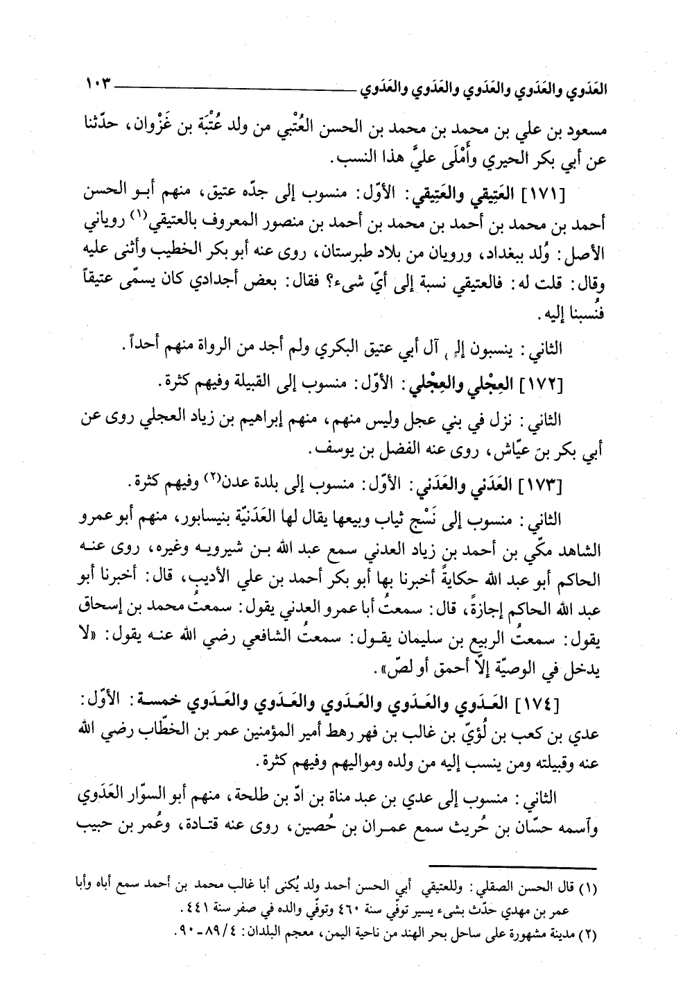 (173) الْعَدنِي والعدني الأول مَنْسُوب إِلَى بَلْدَة عدن وَفِيهِمْ كَثْرَة