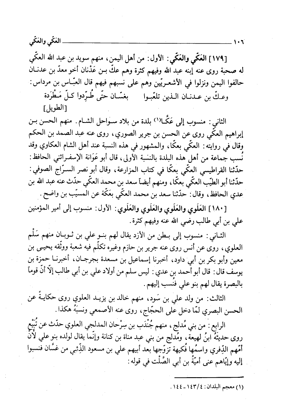 (179) العكي والعكي الأول من أهل الْيمن مِنْهُم سُوَيْد بن عبد الله العكي لَهُ صُحْبَة روى عَنهُ إبنه عبد الله وَفِيهِمْ كَثْرَة وهم عك بن عدنان أَخُو معد بن عدنان حالفوا الْيمن ونزلوا فِي الْأَشْعَرِيين وهم على نسبهم فيهم قَالَ الْعَبَّاس بن مرداس ... وعك بن عدنان الَّذين تلعبوا ... بغسان حَتَّى طردوا كل مطردَة ...