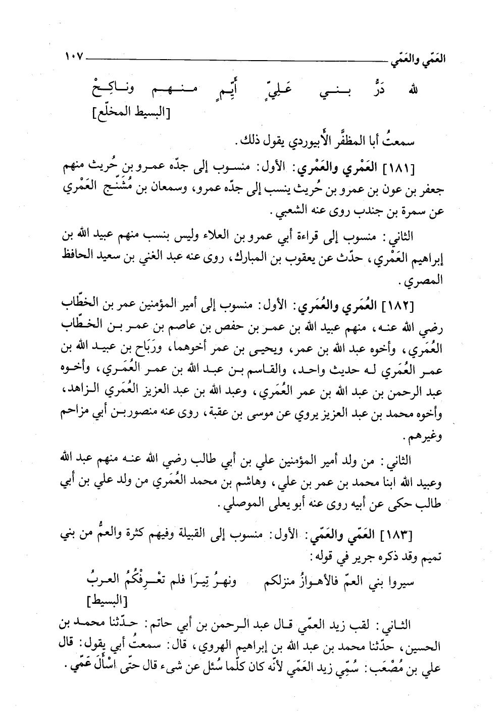(181) الْعمريّ والعمري الأول مَنْسُوب إِلَى جده عَمْرو بن حُرَيْث مِنْهُم جَعْفَر بن عون بن عَمْرو بن حُرَيْث ينْسب إِلَى جده عَمْرو وسمعان بن مشنج الْعمريّ عَن سَمُرَة بن جُنْدُب روى عَنهُ الشّعبِيّ