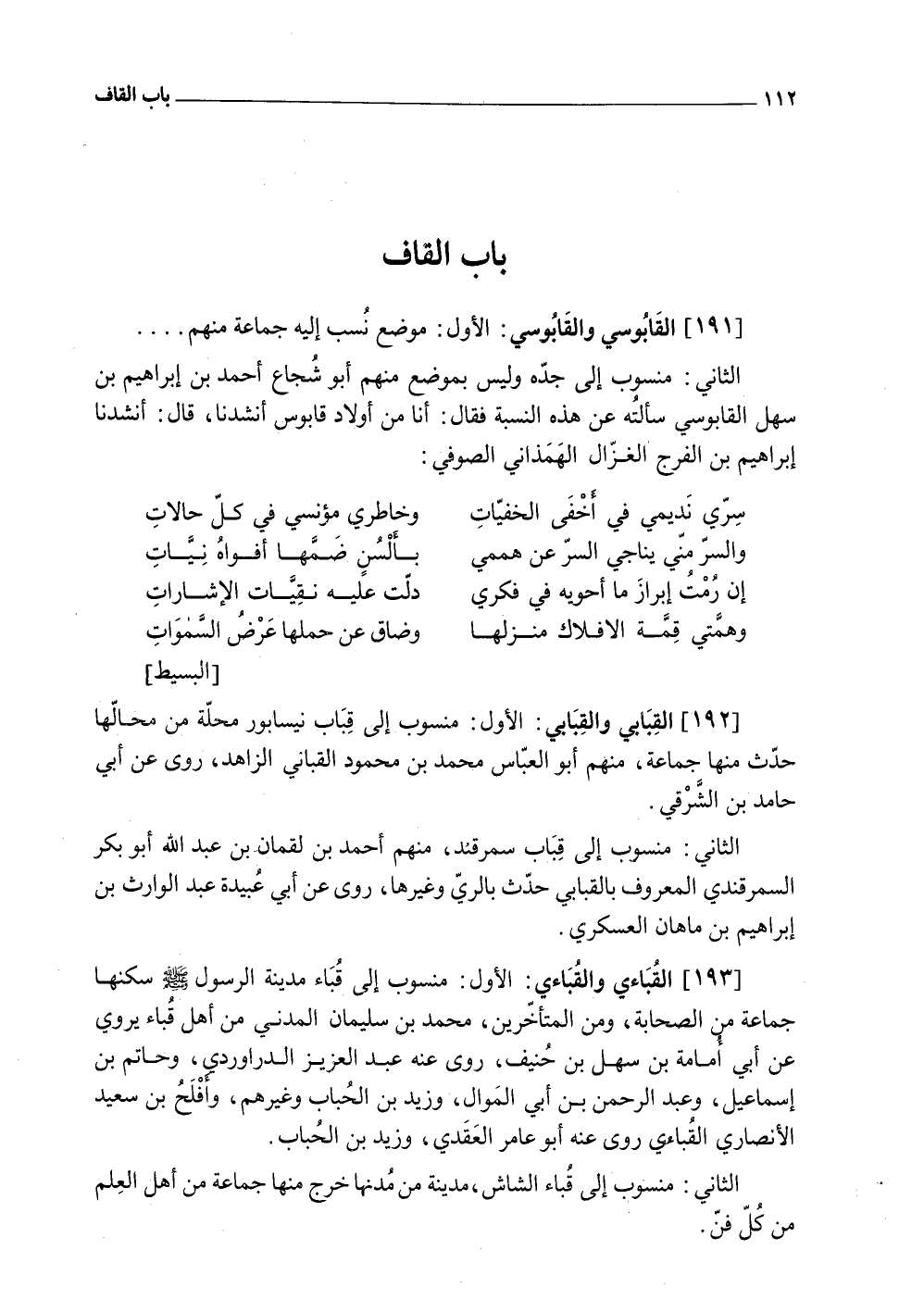(192) القبابي والقبابي الأول مَنْسُوب إِلَى قباب نيسابور محلّة من محالها حدث مِنْهَا جمَاعَة مِنْهُم أَبُو الْعَبَّاس مُحَمَّد بن مَحْمُود القباني الزَّاهِد روى عَن أبي حَامِد بن الشَّرْقِي