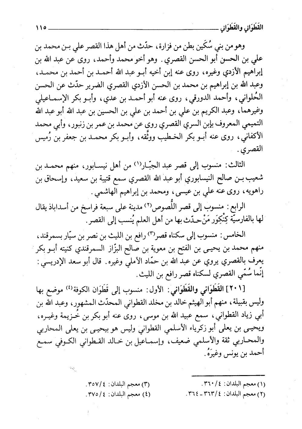 (201) الْقَطوَانِي والقطواني الأول مَنْسُوب إِلَى قطوان الْكُوفَة مَوضِع بهَا وَلَيْسَ بقبيلة مِنْهُم أَبُو الْهَيْثَم خَالِد بن مخلد الْقَطوَانِي الْمُحدث الْمَشْهُور وَعبد الله بن أبي زِيَاد الْقَطوَانِي سمع عبيد الله بن مُوسَى روى عَنهُ أَبُو بكر بن خُزَيْمَة وَغَيره وَيحيى بن يعلى أَبُو زَكَرِيَّاء الْأَسْلَمِيّ الْقَطوَانِي وَلَيْسَ هُوَ بِيَحْيَى بن يعلى الْمحَاربي والمحاربي ثِقَة والأسلمي ضَعِيف وَإِسْمَاعِيل بن خَالِد الْقَطوَانِي الْكُوفِي سمع أَحْمد بن يُونُس وَغَيره