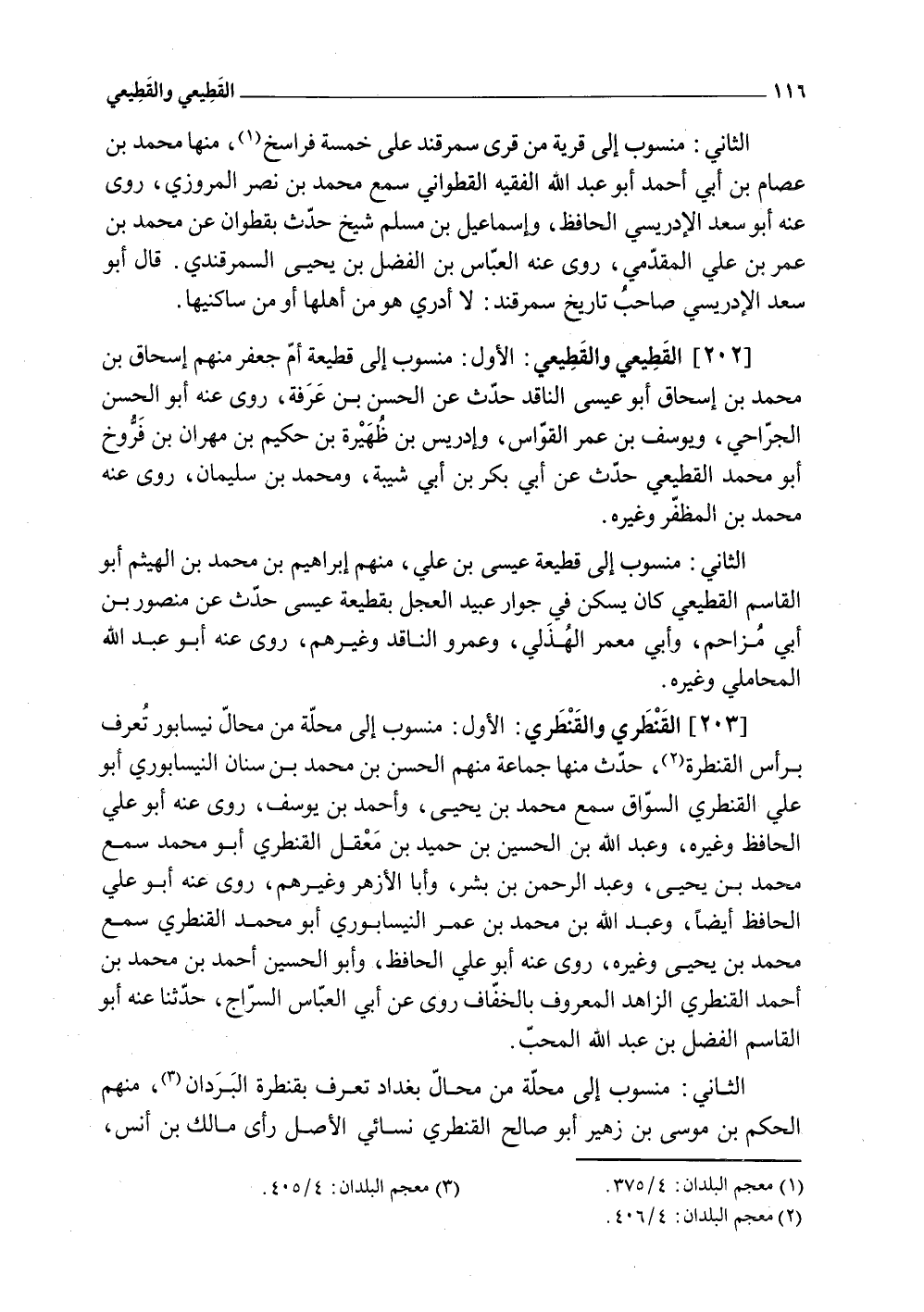 (202) الْقطيعِي والقطيعي الأول مَنْسُوب إِلَى قطيعة أم جَعْفَر مِنْهُم إِسْحَاق بن مُحَمَّد بن إِسْحَاق أَبُو عِيسَى النَّاقِد حدث عَن الْحسن بن عَرَفَة روى عَنهُ أَبُو الْحسن الجراحي ويوسف بن عمر القواس وَإِدْرِيس بن ظهيرة بن حَكِيم بن مهْرَان بن فروخ أَبُو مُحَمَّد الْقطيعِي حدث عَن أبي بكر بن أبي شيبَة وَمُحَمّد بن سُلَيْمَان روى عَنهُ مُحَمَّد بن المظفر وَغَيره