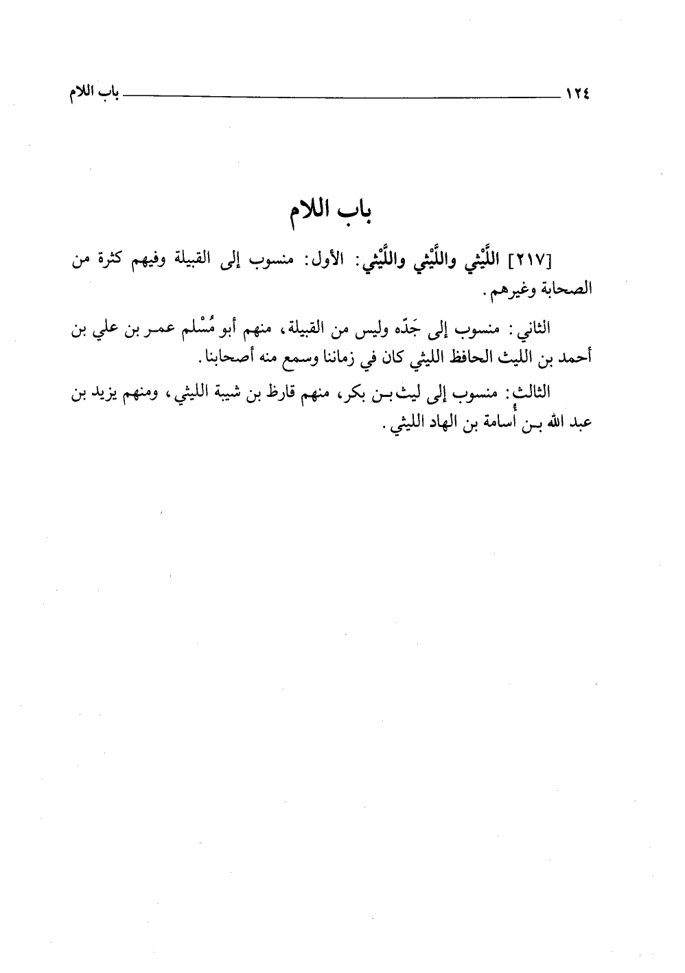 (217) اللَّيْثِيّ والليثي والليثي الأول مَنْسُوب إِلَى الْقَبِيلَة وَفِيهِمْ كَثْرَة من الصَّحَابَة وَغَيرهم