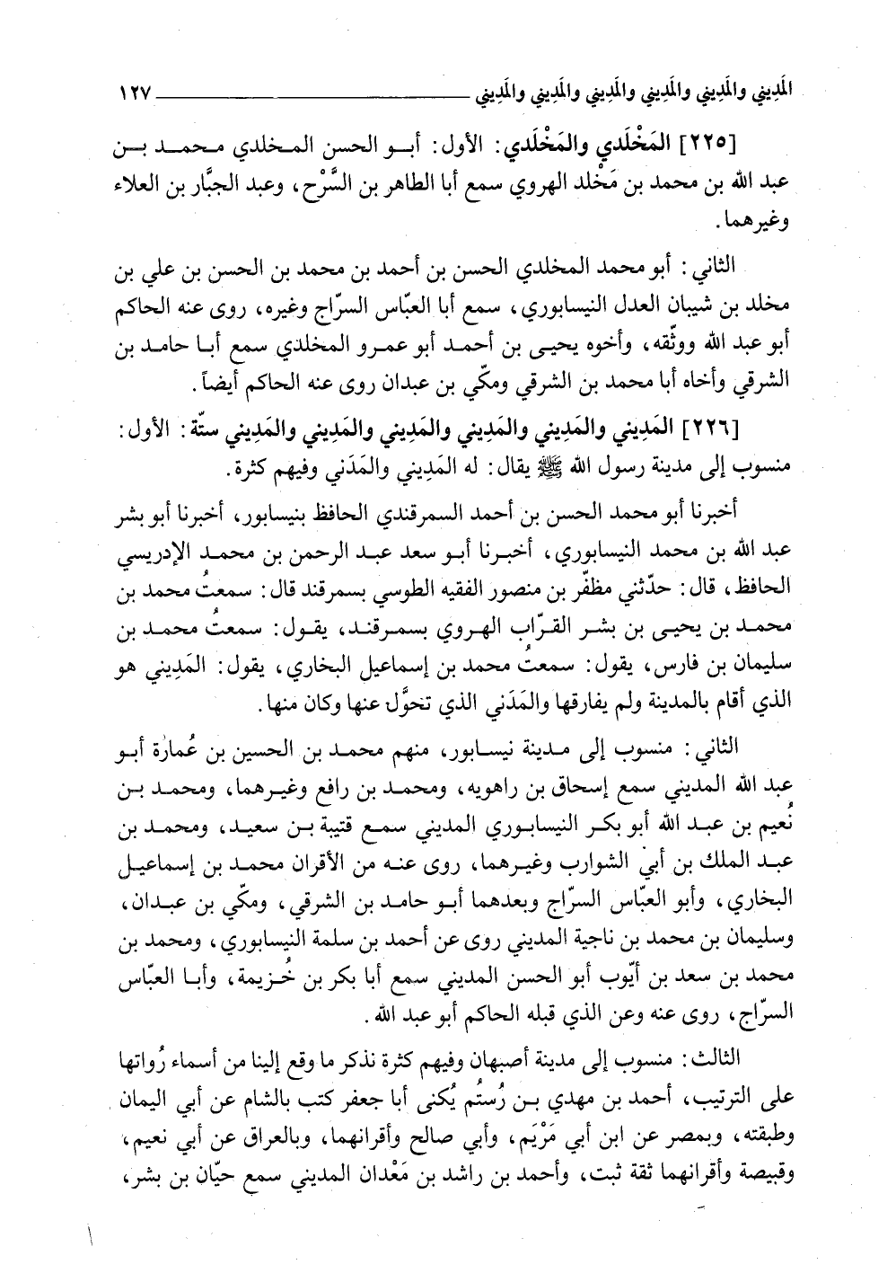 (226) الْمَدِينِيّ والمديني والمديني والمديني والمديني والمديني سِتَّة الأول مَنْسُوب إِلَى مَدِينَة رَسُول الله صلى الله عَلَيْهِ وَسلم يُقَال لَهُ الْمَدِينِيّ وَالْمَدَنِي وَفِيهِمْ كَثْرَة