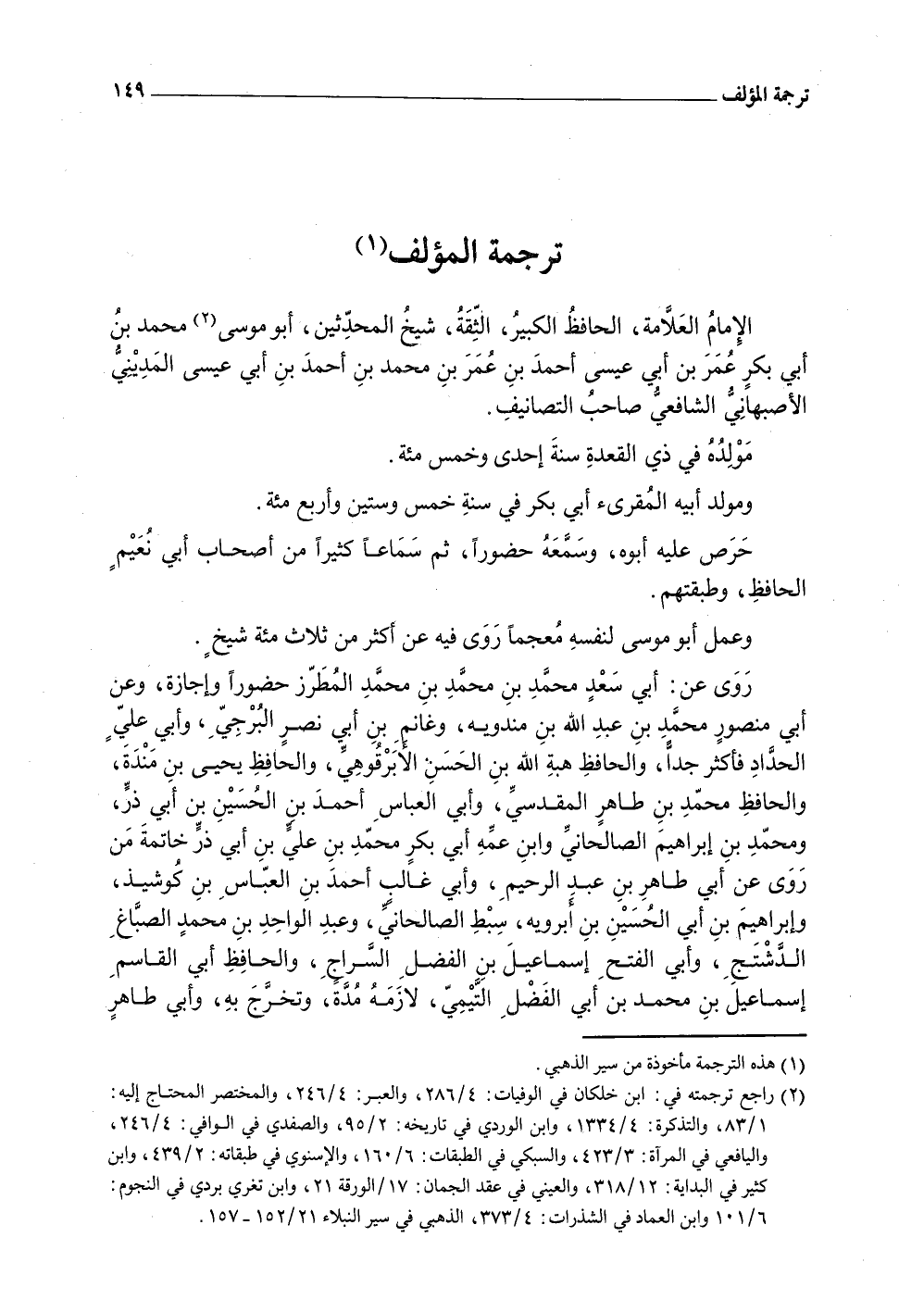 الإِمَام الْعَلامَة الْحَافِظ الْكَبِير الثِّقَة شيخ الْمُحدثين أَبُو مُوسَى مُحَمَّد بن أبي بكر عمر بن أبي عِيسَى أَحْمد بن عمر بن مُحَمَّد بن أَحْمد بن أبي عِيسَى الْمَدِينِيّ الْأَصْبَهَانِيّ الشَّافِعِي صَاحب التصانيف