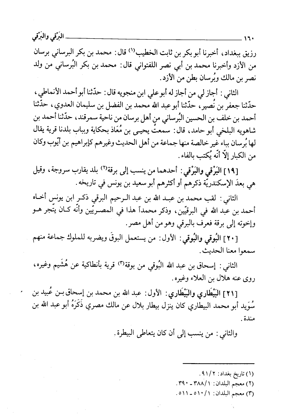 (19) البرقي والبرقي أَحدهمَا من ينْسب إِلَى برقة بلد يُقَارب سروجة وَقيل هِيَ بعد الْإسْكَنْدَريَّة ذكرهم أَو أَكْثَرهم أَبُو سعيد بن يُونُس فِي تَارِيخه