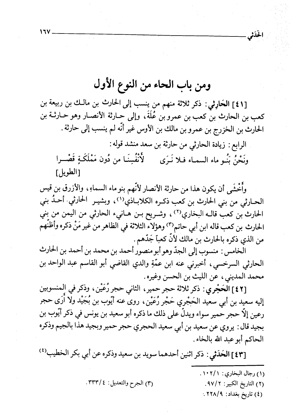 (41) الْحَارِثِيّ ذكر ثَلَاثَة مِنْهُم من ينْسب إِلَى الْحَارِث بن مَالك بن ربيعَة بن كَعْب بن الْحَارِث بن كَعْب بن عَمْرو بن عِلّة وَإِلَى حَارِثَة الْأَنْصَار وَهُوَ حَارِثَة بن الْحَارِث بن الْخَزْرَج بن عَمْرو بن مَالك بن الْأَوْس غير أَنه لم ينْسب إِلَى حَارِثَة