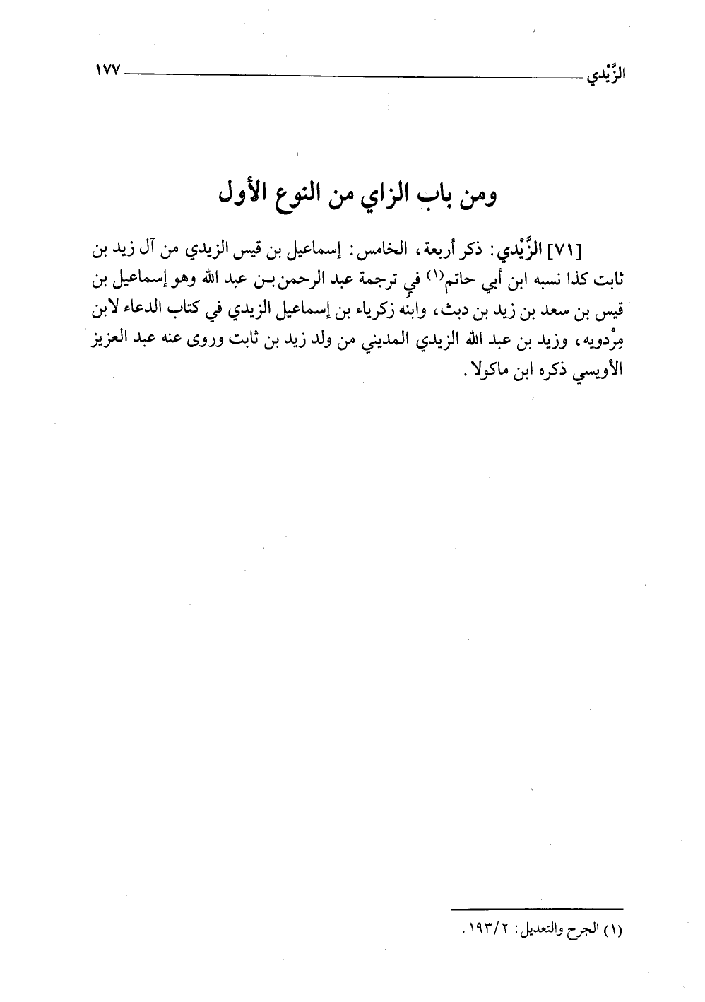 (71) الزيدي ذكر أَرْبَعَة الْخَامِس إِسْمَاعِيل بن قيس الزيدي من آل زيد بن ثَابت كَذَا نسبه ابْن أبي حَاتِم فِي تَرْجَمَة عبد الرَّحْمَن بن عبد الله وَهُوَ إِسْمَاعِيل بن قيس بن سعد بن زيد بن دبث وَابْنه زَكَرِيَّاء بن إِسْمَاعِيل الزيدي فِي