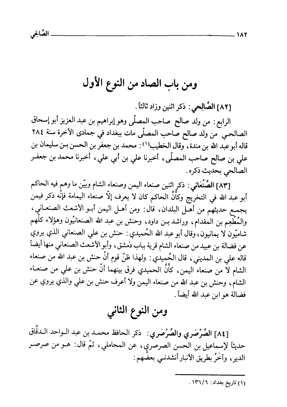 (83) الصَّنْعَانِيّ ذكر اثْنَيْنِ صنعاء الْيمن وَصَنْعَاء الشَّام وَبَين مَا وهم فِيهِ الْحَاكِم أَبُو عبد الله فِي التَّخْرِيج وَكَأن الْحَاكِم كَانَ لَا يعرف إِلَّا صنعاء الْيَمَامَة فَإِنَّهُ ذكر فِيمَن يجمع حَدِيثهمْ من أهل الْبلدَانِ قَالَ وَمن أهل الْيمن أَبُو الْأَشْعَث الصَّنْعَانِيّ والمطعم بن الْمِقْدَام وَرَاشِد بن دَاوُد وحنش بن عبد الله الصنعانيون وَهَؤُلَاء كلهم شَامِيُّونَ لَا يمانيون وَقَالَ أَبُو عبد الله الْحميدِي حَنش بن عَليّ الصَّنْعَانِيّ الَّذِي يروي عَن فضَالة بن عبيد من صنعاء الشَّام قَرْيَة بِبَاب دمشق وَأَبُو الْأَشْعَث الصَّنْعَانِيّ مِنْهَا أَيْضا قَالَه عَليّ بن الْمَدِينِيّ قَالَ الْحميدِي وَلِهَذَا ظن قوم أَن حَنش بن عبد الله من صنعاء الشَّام لَا من صنعاء الْيمن كَأَن الْحميدِي فرق بَينهمَا أَن حَنش بن عَليّ من صنعاء الشَّام وحنش بن عبد الله من صنعاء الْيمن وَلَا أعرف حَنش بن عَليّ وَالَّذِي يروي عَن فضَالة هوابن عبد الله أَيْضا