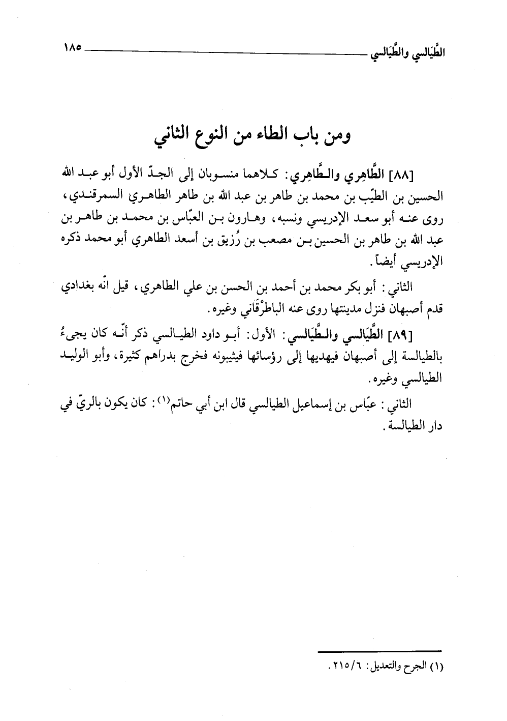 (89) الطَّيَالِسِيّ وَالطَّيَالِسِي الأول أَبُو دَاوُد الطَّيَالِسِيّ ذكر أَنه كَانَ يجِئ بالطيالسة إِلَى أَصْبَهَان فيهديها إِلَى رؤسائها فيثيبونه فَخرج بِدَرَاهِم كَثِيرَة وَأَبُو الْوَلِيد الطَّيَالِسِيّ وَغَيره