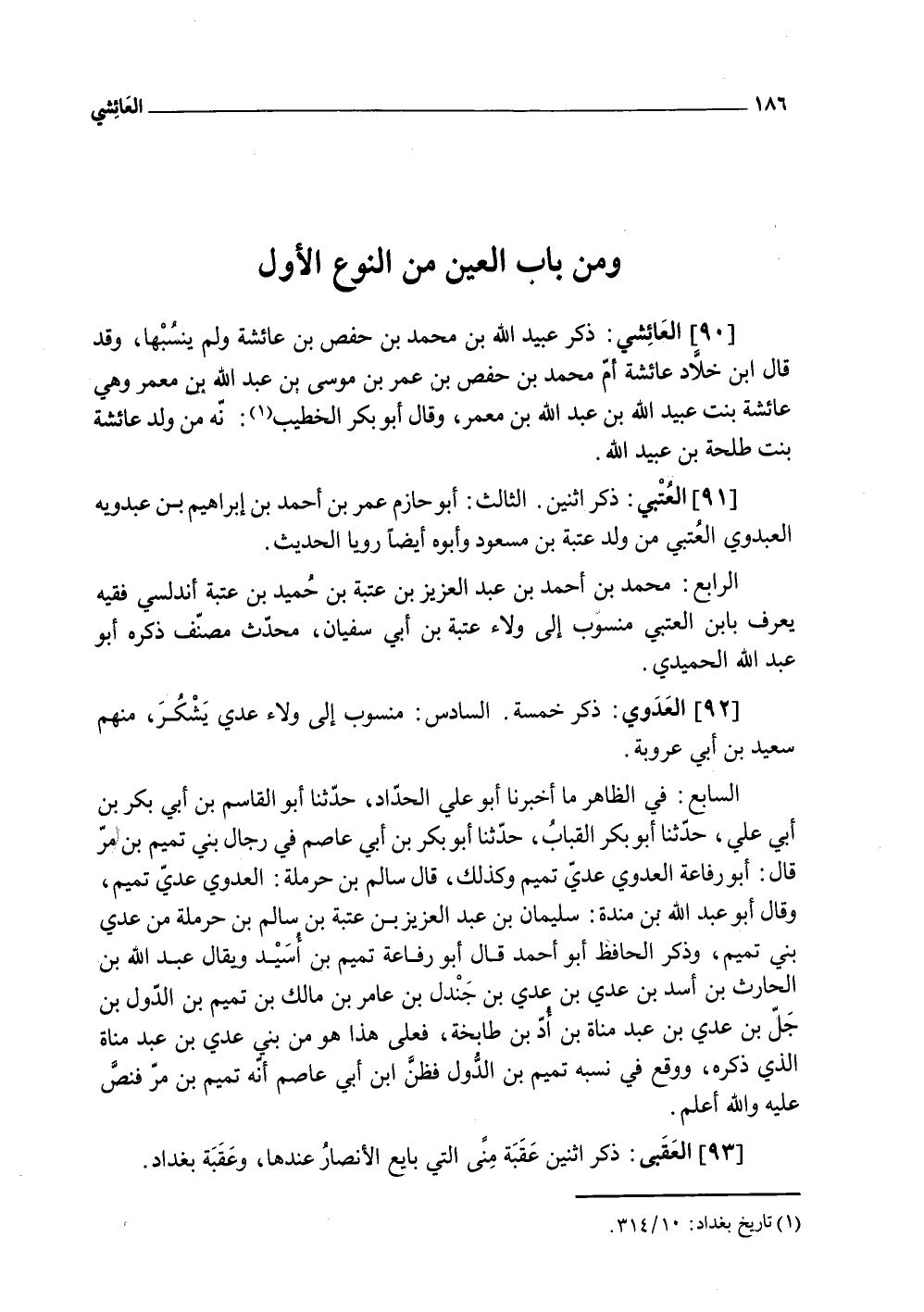 (90) العائشي ذكر عبيد الله بن مُحَمَّد بن حَفْص بن عَائِشَة وَلم ينسبها وَقد قَالَ ابْن خَلاد عَائِشَة أم مُحَمَّد بن حَفْص بن عمر بن مُوسَى بن عبد الله بن معمر وَهِي عَائِشَة بنت عبيد الله بن عبد الله بن معمر وَقَالَ أَبُو بكر الْخَطِيب نه من ولد عَائِشَة بنت طَلْحَة بن عبيد الله
