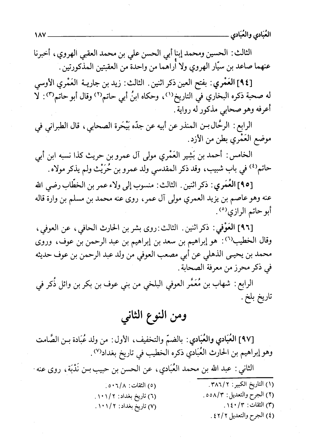 (95) الْعمريّ ذكر اثْنَيْنِ الثَّالِث مَنْسُوب إِلَى وَلَاء عمر بن الْخطاب رَضِي الله عَنهُ وَهُوَ عَاصِم بن يزِيد الْعمريّ مولى آل عمر روى عَنهُ مُحَمَّد بن مُسلم بن وارة قَالَه أَبُو حَاتِم الرَّازِيّ