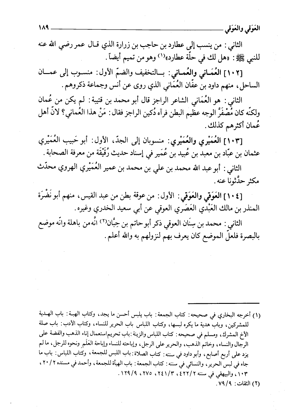 (103) العميري والعميري منسوبان إِلَى الْجد الأول أبوحبيب العميري عُثْمَان بن عباد بن معبد بن عبيد بن عُمَيْر فِي إِسْنَاد حَدِيث رقيقَة من معرفَة الصَّحَابَة