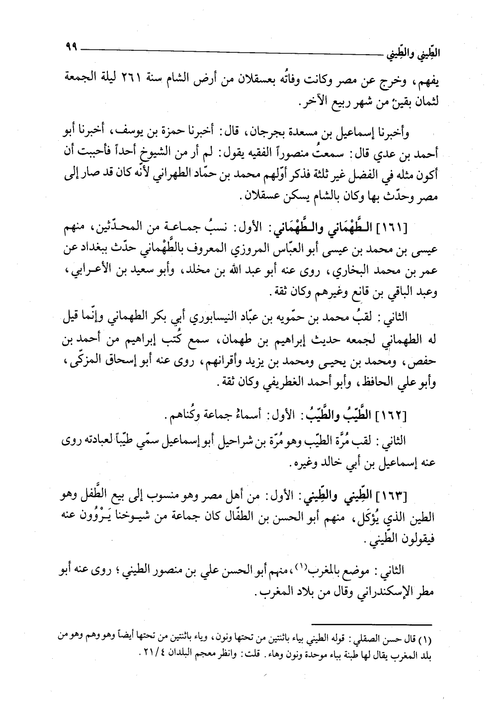 (163) الطيني والطيني الأول من أهل مصر وَهُوَ مَنْسُوب إِلَى بيع الطِّفْل وَهُوَ الطين الَّذِي يُؤْكَل مِنْهُم أَبُو الْحسن بن الطفال كَانَ جمَاعَة من شُيُوخنَا يروون عَنهُ فَيَقُولُونَ الطيني