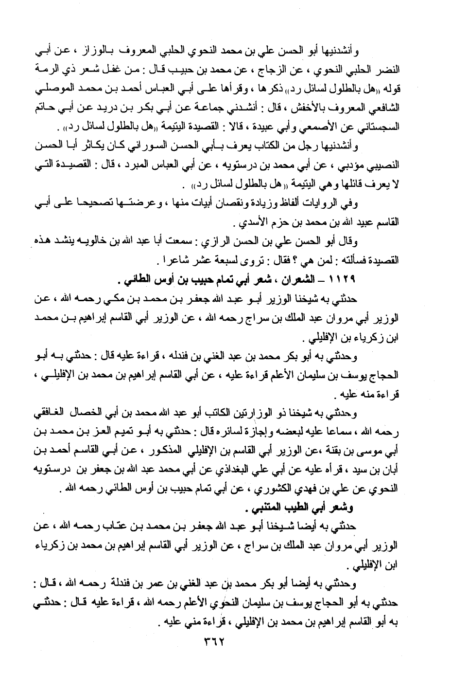 وحَدثني بِهِ شَيخنَا ذُو الوزارتين الْكَاتِب أَبُو عبد الله مُحَمَّد بن أبي الْخِصَال الغافقي رَحمَه الله سَمَاعا عَلَيْهِ لبعضه وإجازة لسائره قَالَ حَدثنِي بِهِ أَبُو تَمِيم الْعِزّ بن مُحَمَّد بن أبي مُوسَى بن بقنة عَن الْوَزير أبي الْقَاسِم بن الإفليلي الْمَذْكُور عَن أبي الْقَاسِم أَحْمد بن أبان بن سيد قَرَأَهُ عَلَيْهِ عَن أبي عَليّ البغداذي عَن أبي مُحَمَّد عبد الله بن جَعْفَر بن درسْتوَيْه النَّحْوِيّ عَن عَليّ بن فهدي الكشوري عَن أبي تَمام حبيب بن أَوْس الطَّائِي رَحمَه الله