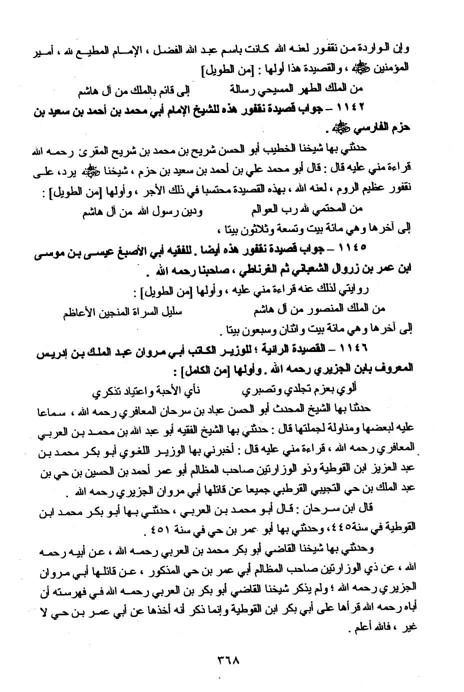 451 - وحَدثني بهَا شَيخنَا القَاضِي أَبُو بكر مُحَمَّد بن الْعَرَبِيّ رَحمَه الله عَن أَبِيه رَحمَه الله عَن ذِي الوزارتين صَاحب الْمَظَالِم أبي عمر بن حَيّ الْمَذْكُور عَن قَائِلهَا أبي مَرْوَان الجزيري رَحمَه الله وَلم يذكر شَيخنَا القَاضِي أَبُو بكر بن الْعَرَبِيّ رَحمَه الله فِي فهرسته أَن أَبَاهُ رَحمَه الله قَرَأَهَا على أبي بكر ابْن الْقُوطِيَّة وَإِنَّمَا ذكر أَنه أَخذهَا عَن أبي عمر بن حَيّ لَا غير فَالله أعلم