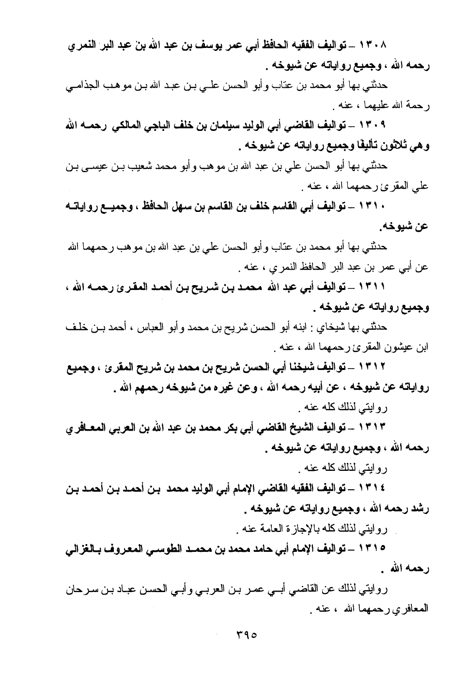 1313 - تواليف الشَّيْخ القَاضِي أبي بكر مُحَمَّد بن عبد الله بن الْعَرَبِيّ الْمعَافِرِي رَحمَه الله وَجَمِيع رواياته عَن شُيُوخه