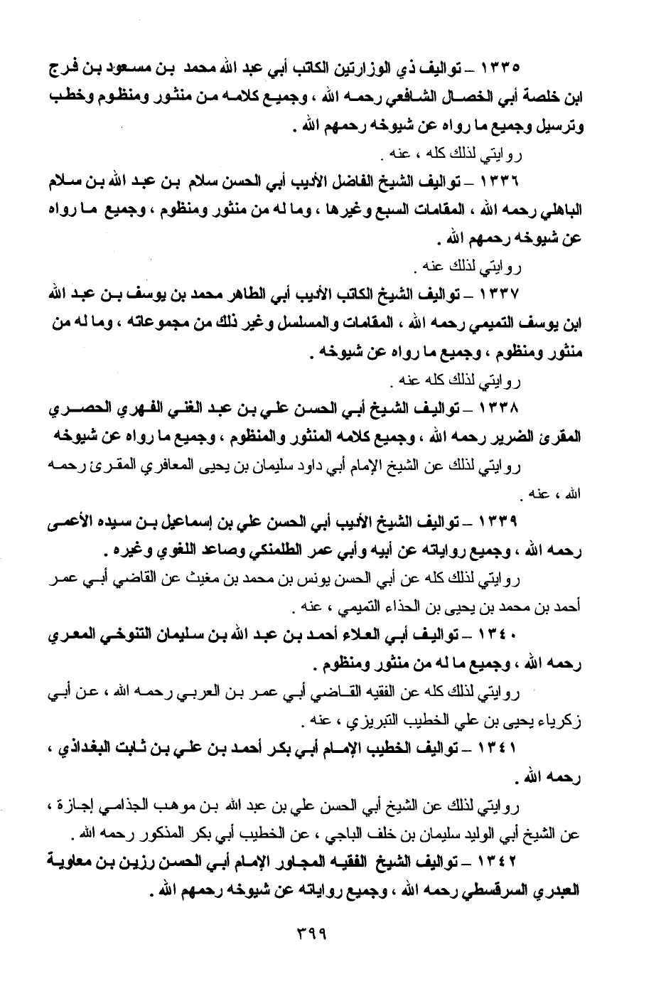 1339 - تواليف الشَّيْخ الأديب أبي الْحسن عَليّ بن إِسْمَاعِيل بن سَيّده الْأَعْمَى رَحمَه الله وَجَمِيع رواياته عَن أَبِيه وَأبي عمر الطلمنكي وصاعد اللّغَوِيّ وَغَيره روايتي لذَلِك كُله عَن أبي الْحسن يُونُس بن مُحَمَّد بن مغيث عَن القَاضِي أبي عمر أَحْمد بن مُحَمَّد بن يحيى بن الْحذاء التَّمِيمِي عَنهُ