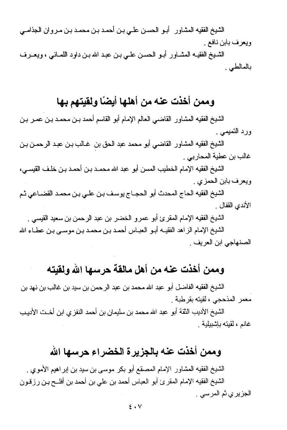وَمِمَّنْ أخذت عَنهُ من أَهلهَا أَيْضا ولقيتهم بهَا