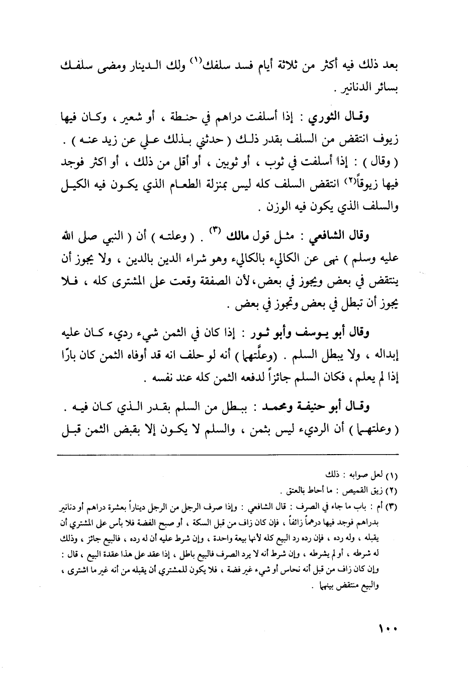 وقال الثوري إذا أسلفت دراهم في حنطة أو شعير وكان فيها زيوف انتقض من السلف بقدر ذلك "حدثني بذلك علي عن زيد عنه" وقال إذا أسلفت في ثوب أو ثوبين أو أقل من ذلك أو أكثر فوجد فيها زيوقا انتقض السلف كله ليس بمنزلة الطعام الذي يكون فيه الكيل والسلف الذي يكون فيه الوزن.