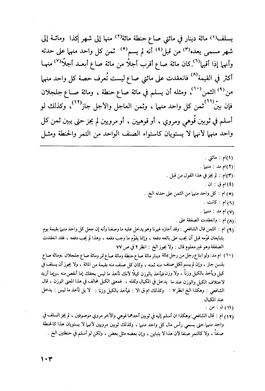 10 أم مد: ولو ابتاع رجل بمائة دينار مائة صاع حنطة ومائة صاع تمر ومائة صاع جلجلان ومائة صاع بلسن جاز، وإن لن يسم لكل صنف منه ثمنه، وكان كل